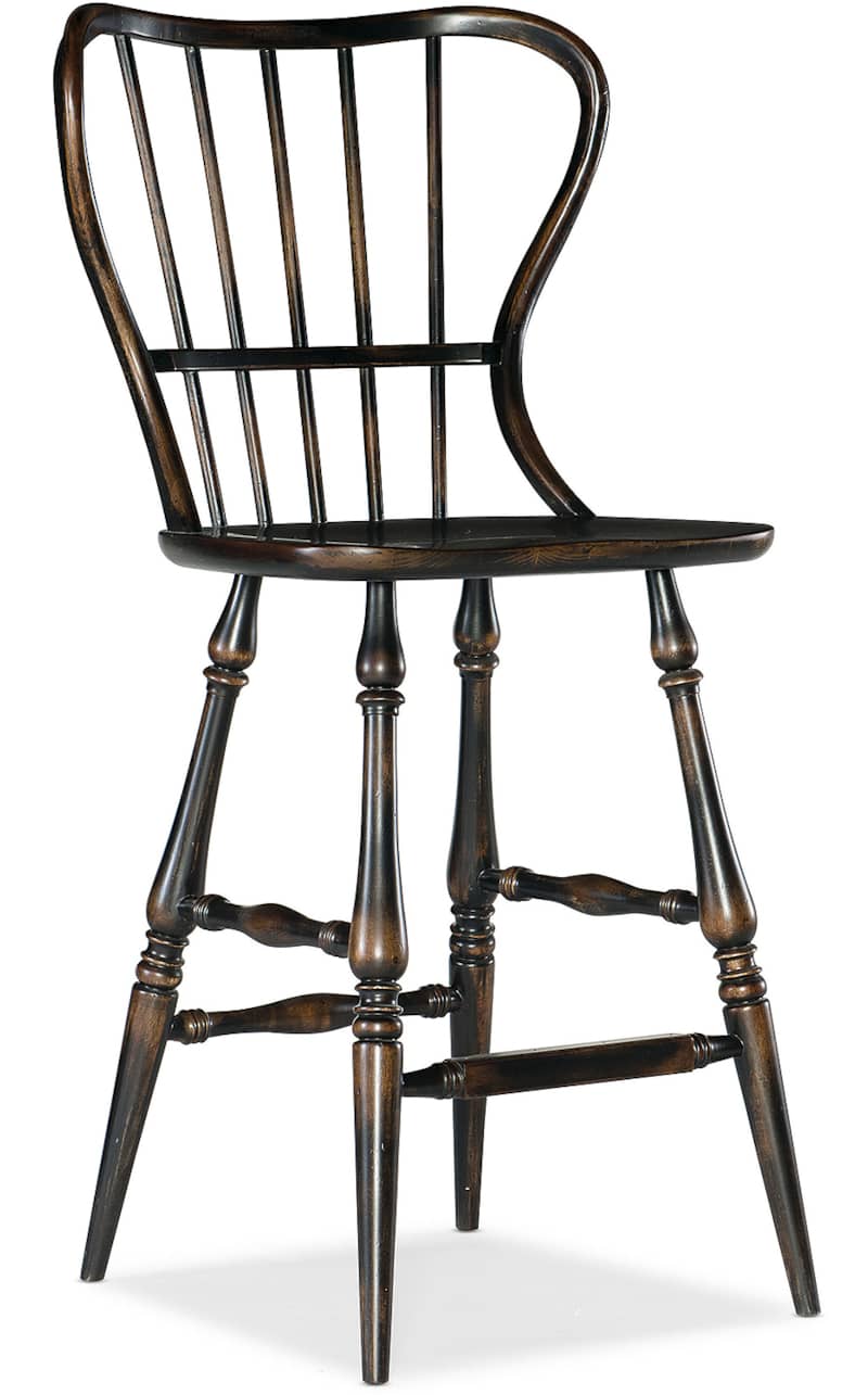 Hooker Furniture Dining Room Ciao Bella Spindle Back Bar Stool – 5805-75361-99With a casual chic spin on classic European farmhouse and cottage style, the graceful silhouette of the Ciao Bella Spindle Back Bar Stool is destined to be a favorite of family and guests alike. The compelling, multi-layered black finish with rub-through and hand distressing adds to the charm and versatility. 48 _ inches high. Inspired by the small farmhouses that dot the French and Italian countryside and have been in the hands of the same family for generations, Hooker Furniture introduces the rustic Ciao Bella Collection. The whole home collection is an eclectic mix of European farmhouse pieces that have the appearance of furniture that has been refinished multiple times as it has passed through the generations. Ciao Bella includes bedroom, dining room, occasional, home office and accent furniture, and features a finish called Timeworn Gray that accentuates the historical nature of European farmhouses – many of which include a variety of furniture styles that have been added by each generation of owners. Features