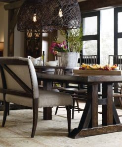 Hooker Furniture 1618-75207-DKW American Life Roslyn County Trestle Dining Table In Dark WalnutIn classic farm-to-decor style, the inviting Roslyn County Trestle Dining Table evokes authenticity with its plank-and-metal-sheeting base reminiscent of trusses in reclaimed barns. The Dark Walnut finish is waxed and luxurious to the touch. Without leaves, the table accommodates 6 guests, and accommodates up to 10 guests with two 21-inch leaves. The server tray is included and can be used with the 1618-75900-DKW buffet. From farm-to-d??cor looks to rustic luxe, AMERICAN LIFE evokes a sense of community, easy living and authentic craftsmanship. The classic farm-to-d??cor collection, Roslyn County, offers heirloom quality and hand-crafted appeal with a simple style that demonstrates how Americans are living. Roslyn County is crafted in Walnut and Hickory, waxed and luxurious to the hand. Roslyn County??s big-scale pieces will be at home all across America. Trestle bases, planking, rake-back spindles and marquetry add interest to the simple lines of Roslyn County. Metal-bar hardware in an oil-rubbed bronze finish with bolts on the ends complete the look. Features