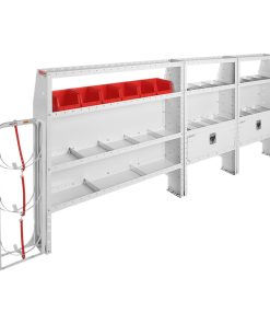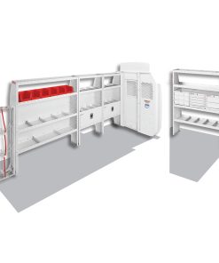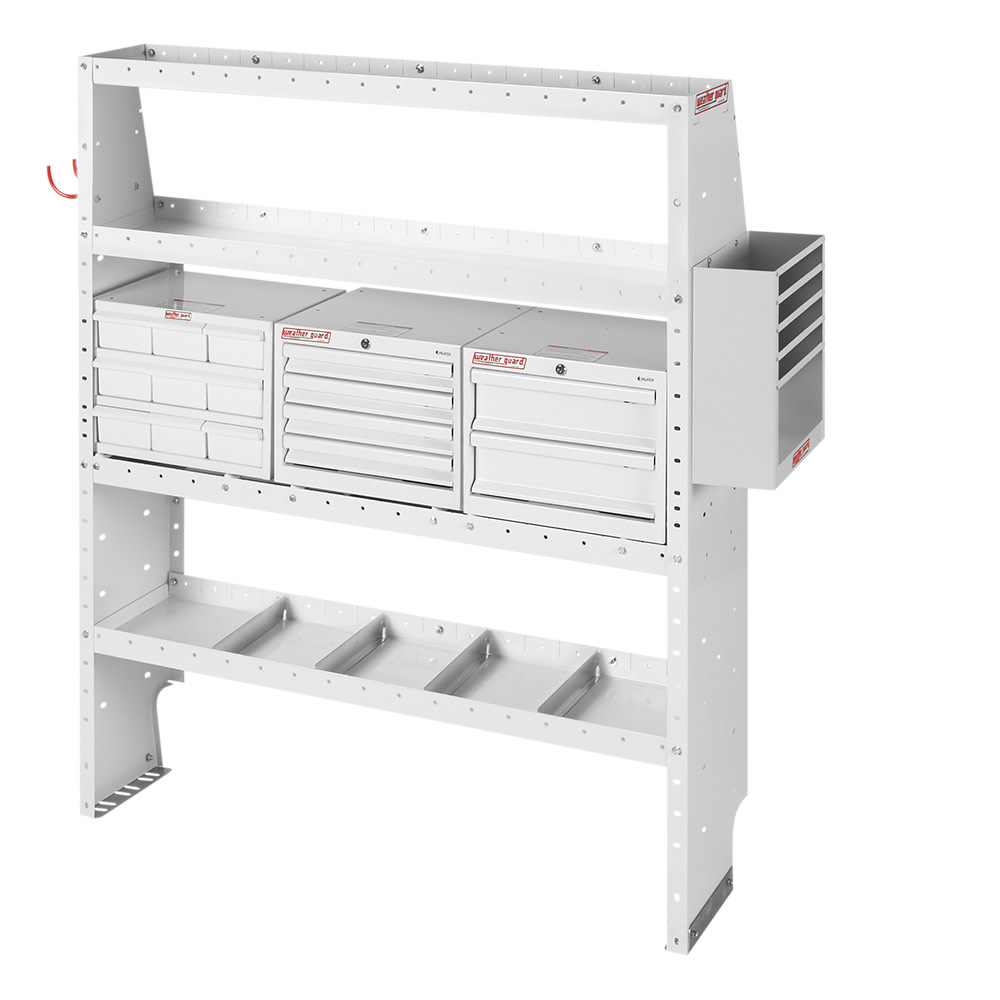 Designed for HVAC professionals and mechanical contractors, the WEATHER GUARD Model 600-8413X van package for High-Roof, 170in extended wheel base Ford Transit vans provides adjustable cargo van shelving sized to fit the commercial van interior, a 5 drawer secure storage cabinet, a shelf door, six medium storage bins, and a tank rack. It includes a sturdy van bulkhead for maximum protection against shifting loads. Additional van products are available to create a custom van storage solution.