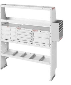 Includes 60in high adjustable cargo van shelving and a mesh van bulkhead with swinging door kit