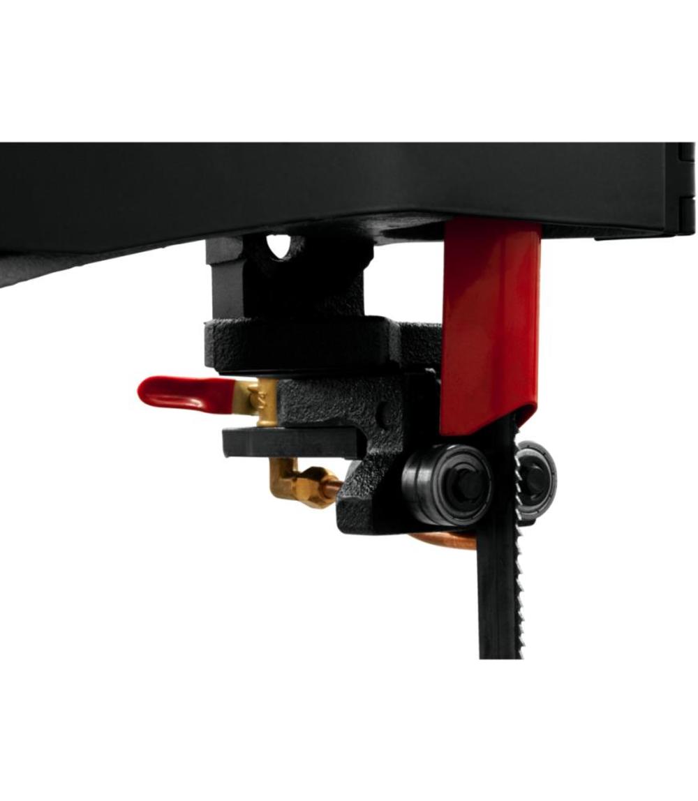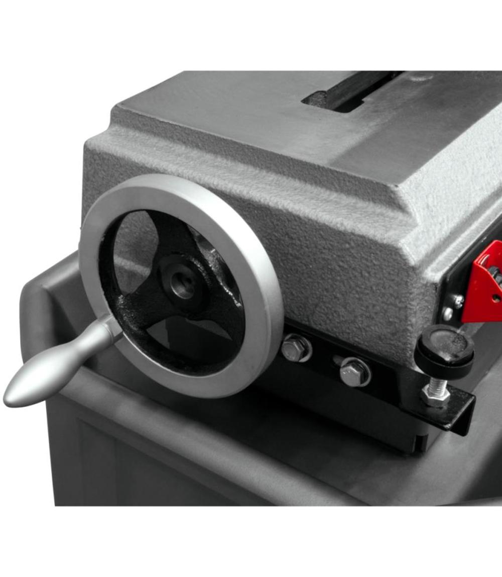 Multi-position blade guides enhance use in vertical position by increasing the throat capacity from 4 In. to 8 In. and creates a safer working position