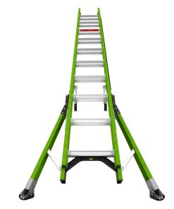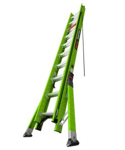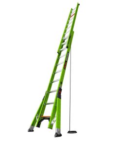 The HyperLite SumoStance Type IAA is the only extension ladder in the world with Little Giant??s patented SumoStance leveling outrigger system, which more than doubles the ladder??s base width and increases side-tip stability. The SumoStance’s intuitive safety features help ensure a safe, stable set-up for any job on almost any surface and is lighter than ordinary extension ladders. The HyperLite SumoStance also offers a side-to-side bubble level and front-to-back angle indicator, making it possible to set up the ladder safely. The side-mounted, dual-pulley system reduces the effort required to lift the fly section by 45% and removes the potential trip hazard caused by traditional center pulley rope systems. Its wide rungs let you work comfortably without foot fatigue. The patent-pending Sure-Set? foot allows you to set the feet in either flat or spike positions and have them stay in place. Little Giant??s patent-pending nonconductive Hi-Viz green rail is safe to use around electricity and has been scientifically proven to be the most visible hue of the color spectrum to the human eye. Why should a ladder need to be Hi-Viz? Some of the most catastrophic falls are caused by people who walk or drive into an extension ladder in use. People die simply because the ladder was not visible.