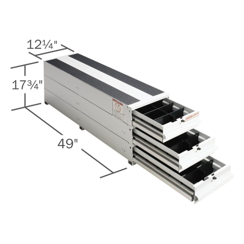This lightweight aluminum van storage solution conveniently increases your van storage space by placing small equipment at your fingertips. Model 327-3 is a triple stacked drawer unit with dividers providing an extensive array of van organizing options.