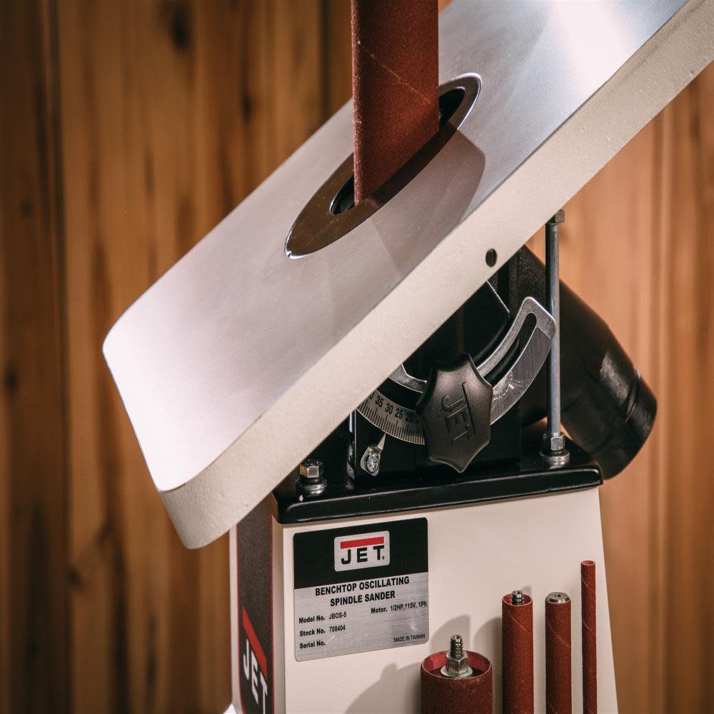 The Jet? JBOS-5, Benchtop Oscillating Spindle Sander, 1/2HP, 1Ph 115V, helps you make quick work of your various sanding tasks. Its spindle moves up and down to reduce friction on the sleeve and prolong its operational life. This Jet benchtop oscillating sander has non-skid rubber foot pads to keep it in place while you work. The table tilts up to 45 degrees to better cover beveled edges. Its spindles have threaded edges to make installation and removal fast and to ensure a secure fit. Table inserts keep dust out of the inner parts and protect you while you work on your projects. A sealed and lubricated box keeps the gears running smoothly.