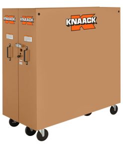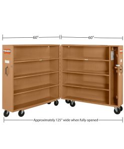 The Model 100 JOBMASTER? Rolling Cabinet, 60.9 cubic feet is a terrific choice for electricians, mechanics, plumbers, and technicians who use and transport smaller tools, supplies, and equipment. It measures 65 inches high and 125 inches wide when fully opened, and has 14 inch deep, welded shelves, giving you a minimum of 12 7/8 inches between each shelf for ample storage space. With a 1,200 load capacity, the KNAACK? rolling cabinet 100K is not only spacious but also sturdy and stable. A baked powder-coat finish and 16 gauge fully arc-welded steel construction ensures cabinet will last through the years and minimizes corrosion and wear and tear. The right side of the tool storage cabinet has a vertical storage area with a bracket to store equipment appropriate for placing in a narrow area.