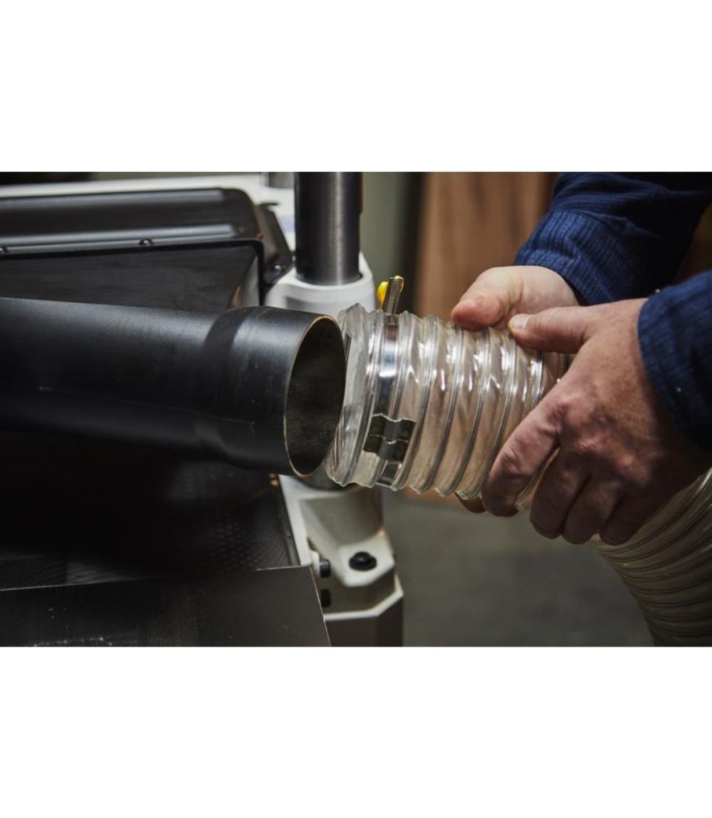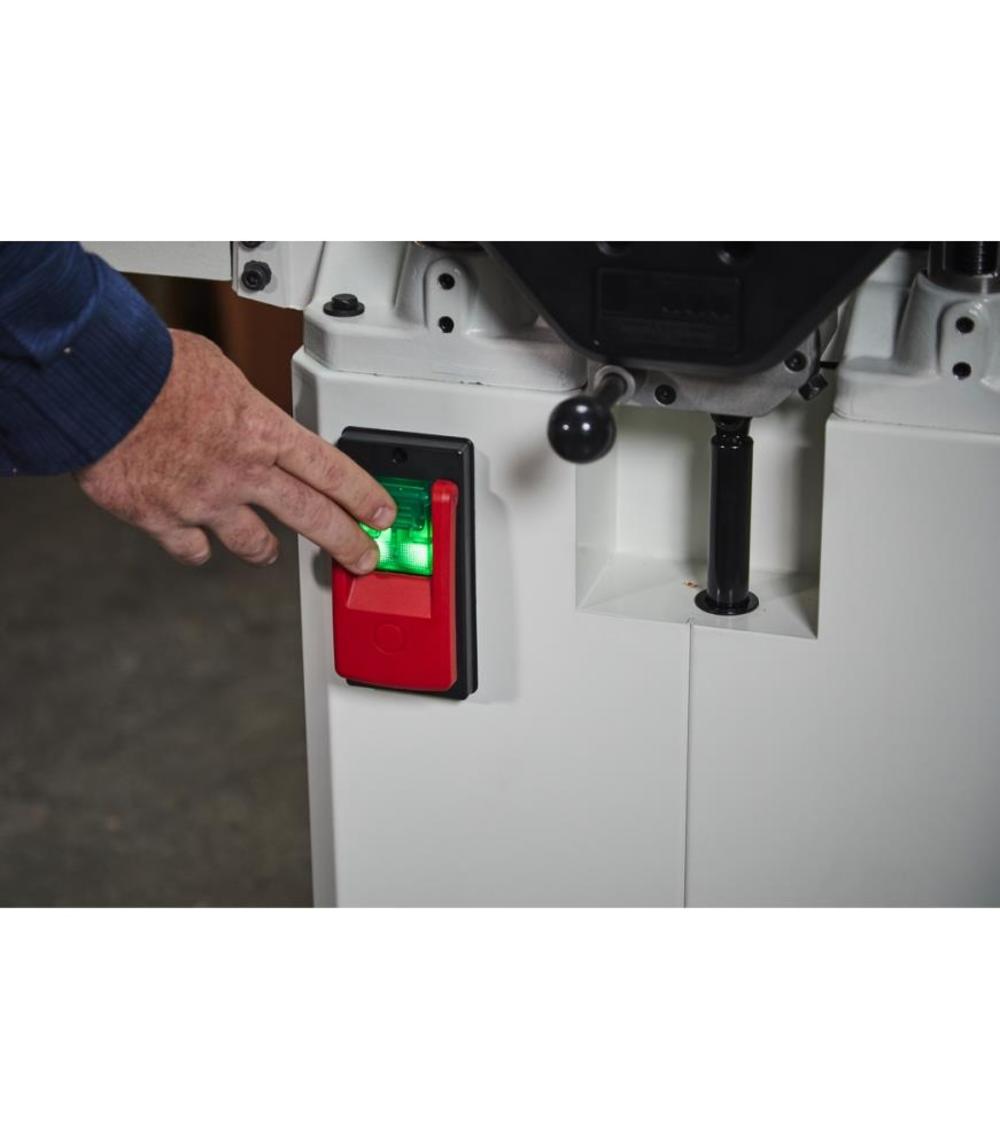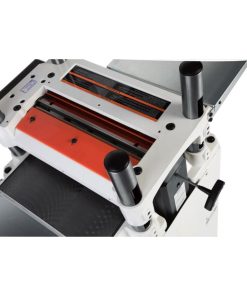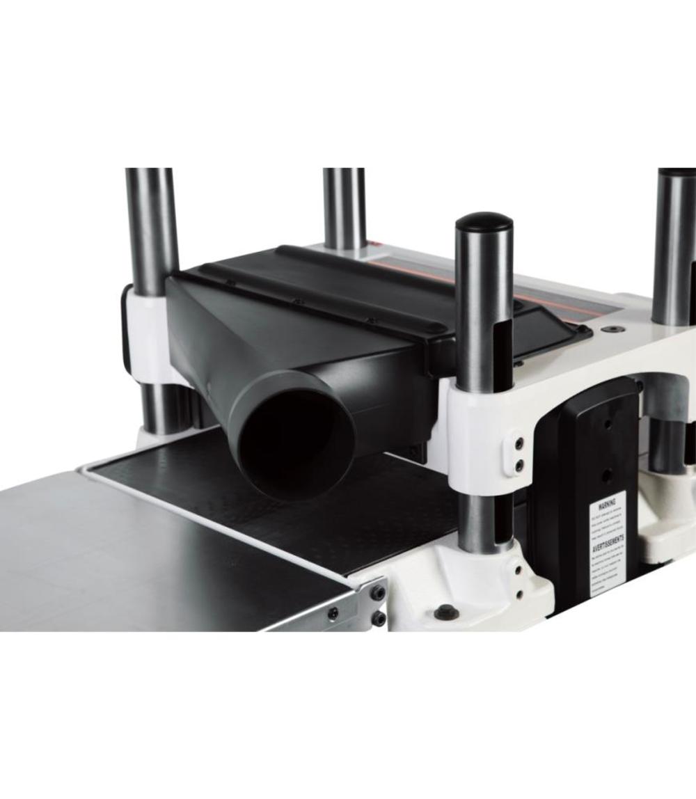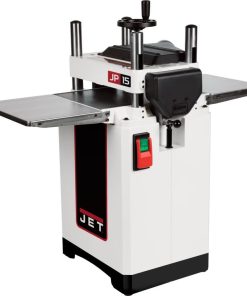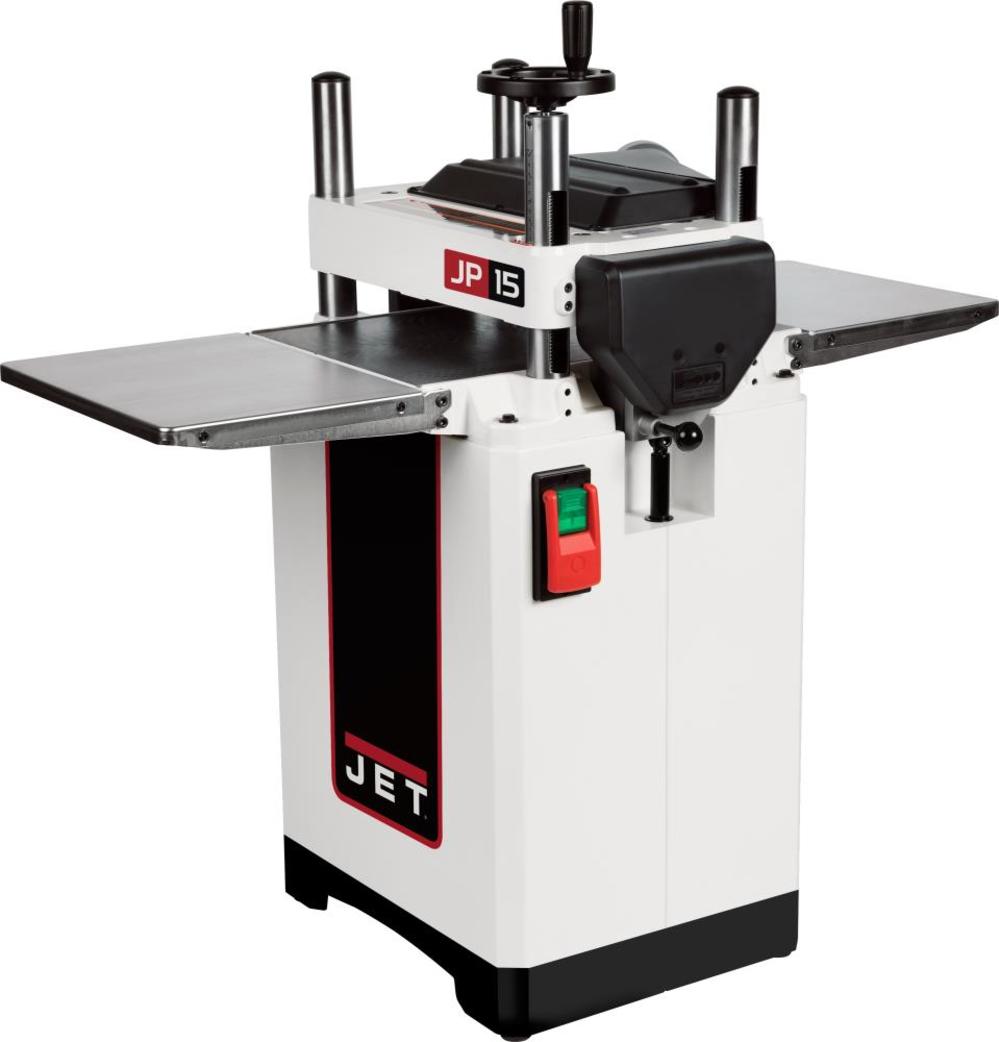 For projects that require board thickness to be beyond exact, the new Jet 15 In. straight knife planer gets the job done with ease. This sweet machine features a monster 3 HP motor with two speed gear box to adjust your feed rate for a better finished surface. The innovative Precision Air Strut System (PASS?) provides consistent upward pressure on the cutter head, reducing the chance of board snipe. Its rock-solid table is constructed of cast iron and features steel Infeed/outfeed table extensions that conveniently fold out of the way. And because even the coolest power planer is one of the messiest machines on the planet, Jet??s angled 4 In. dust port keeps your dust hose out of the way for easy hookup on your shop??s dust collection system.