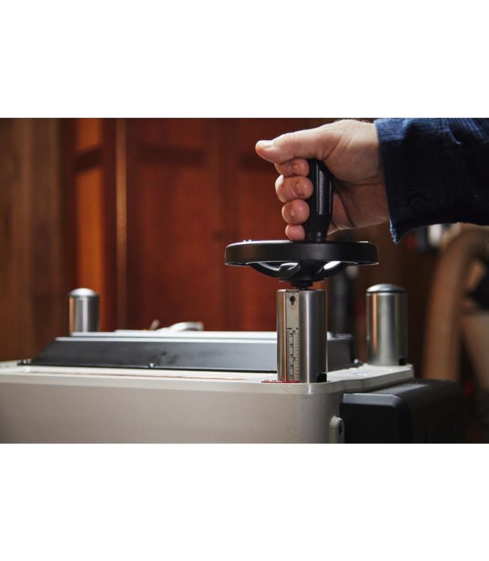 Large hand wheel with positive gear drive easily moves the head to the desired board thickness
