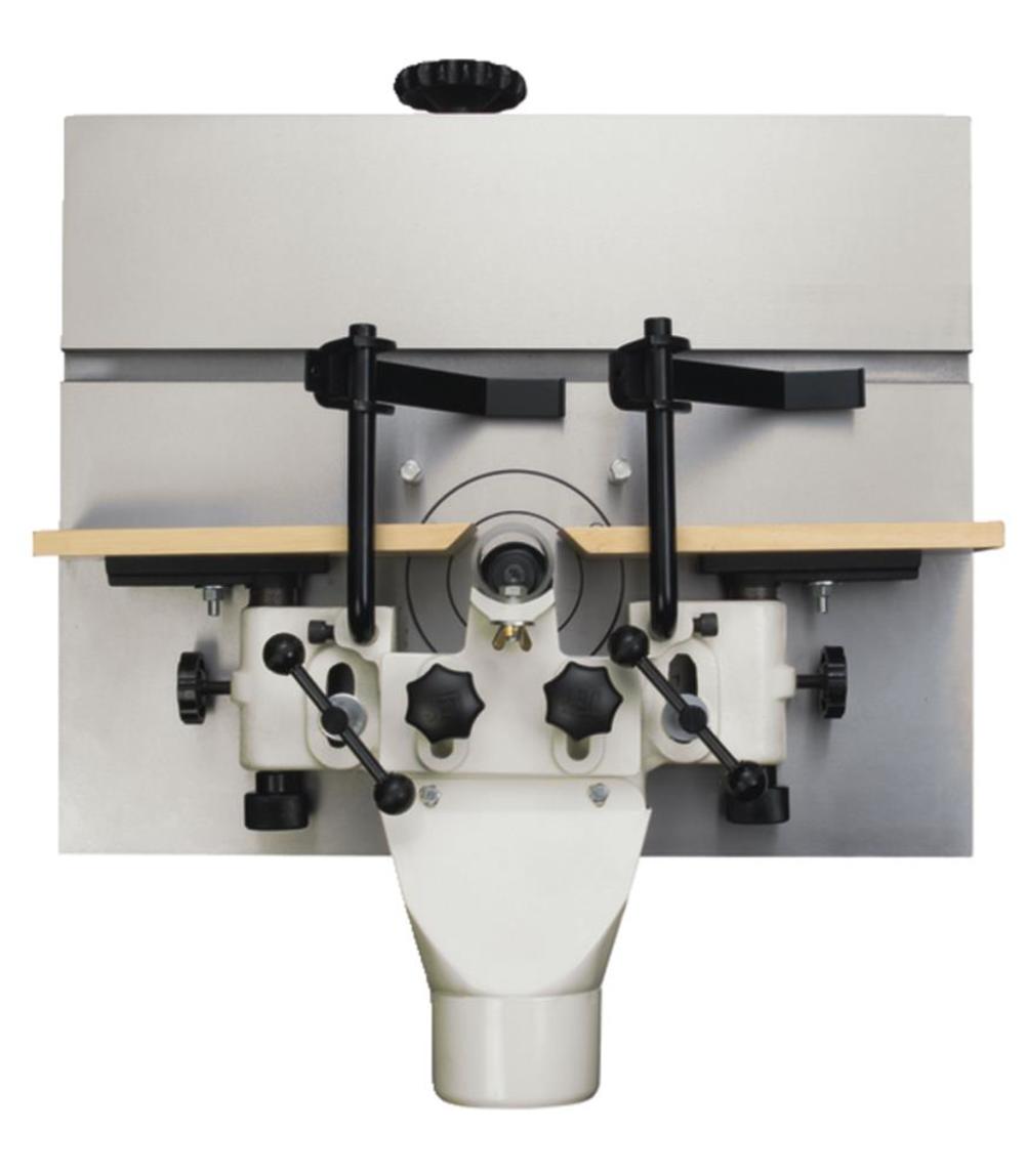 Adjustable work hold-downs mounted to the fence secure your work while shaping