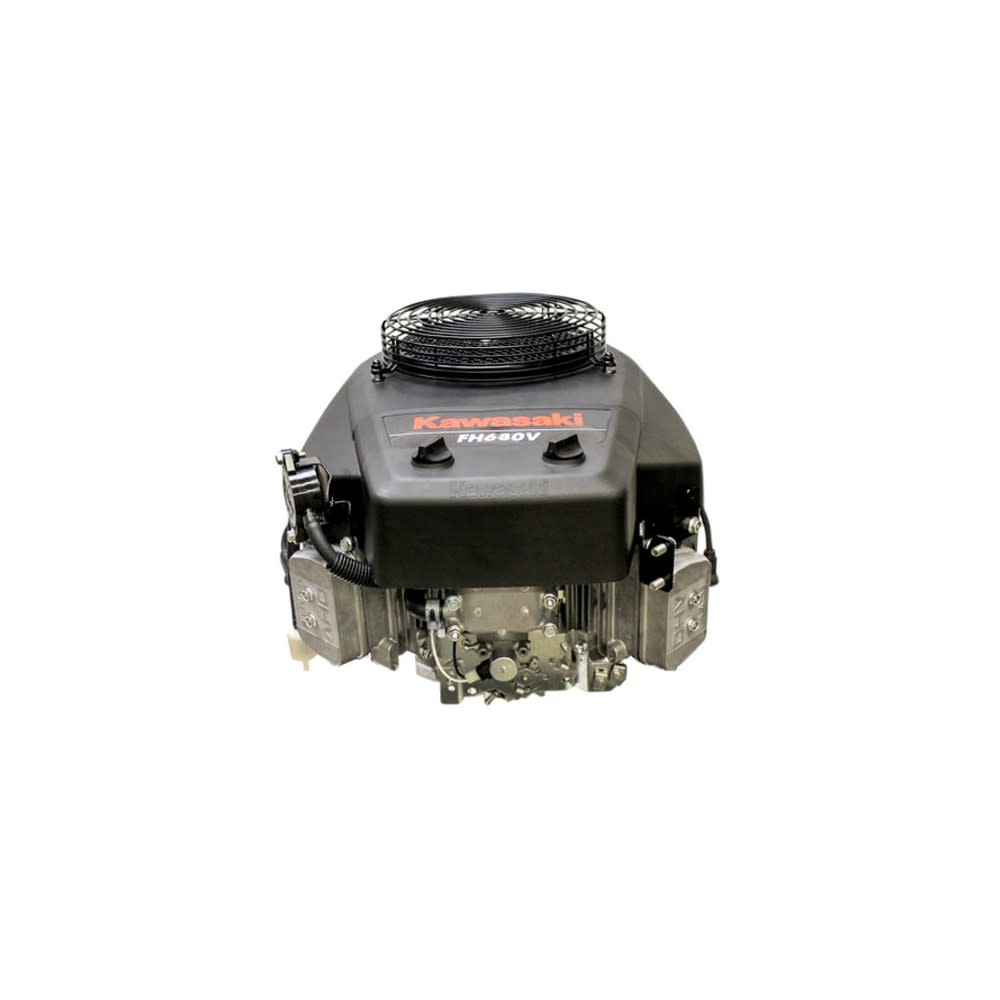 The Kawasaki FH680V is a 0.68 l (675 cc, 41.19 Cu In.) V-twin 90 Deg air-cooled 4-stroke internal combustion small gasoline motor with vertical shaft, manufactured by Kawasaki Heavy Industries Ltd., for general-purpose applications. The FH680V has vertical PTO shaft, V-twin 90 Deg design with cast iron cylinder liners and overhead valves (OHV). The engine is equipped with float type carburetor with fixed main jet, pulse type fuel pump and flywheel magneto transistor type ignition system. The Kawasaki FH680V uses a full pressure lubrication system with spin-on oil filter and dual element air cleaner. The engine was equipped with BENDIX type electric starter and 12V-13A charging coil with a regulator. Cylinder bore and piston stroke are 72.5 mm (2.85 In.) and 76 mm (2.99 In.), respectively. Compression ratio rating is 8.1:1. The Kawasaki FH680V develops 23.4 PS (17.2kW, 23HP) at 3600 Rpm and 54.0 Nm (5.5 kg??m, 39.8 Ft. lb) at 2,400 Rpm of torque.
