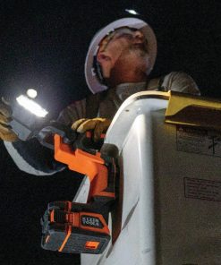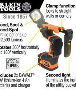 The Utility LED Light is used to light up the surrounding work area during overhead work. The clamp design fits the corners of utility buckets. The mounting handle illuminates the inside of the bucket to find tools quickly and easily. Light is sturdy enough to use standalone on the ground. Designed to fit any DEWALT 20V battery up to 8.0 Ah. Kit includes batteries and charger. Portable, versatile lighting for any worksite. Light up any work area up to 2,500 lumens. Portable, versatile lighting for any worksite. Rotates horizontally and vertically for optimal exposure. Mounting handle features second light to illuminate the inside of the utility bucket to find tools fast. Ergonomic design with one handed operation. Sturdy build to work standalone. IP56 rated. Powered by DeWALT 20V lithium-ion batteries; fits up to 8 Ah. Kit includes light, two 4 Ah batteries and charger. 3 year limited warranty. DeWALT is a registered trademark of the Black & Decker corporation. For more than 160 years, Klein Tools has manufactured premium-quality, professional-grade hand tools that deliver the performance, durability and precision needed to get the job done right. Our family of engineers, workers and craftsman continue to put six generations of expertise into every tool we create by using only the highest quality materials, superior workmanship, and keeping manufacturing as close to home as we can. Klein isn’t just the name of our company, it’s also our family name. And since we’re an American company that’s family-owned and family-run, you know you can count on us to be here tomorrow. Klein Tools doesn’t just make great products, we make great products that stand up to the demands of the professionals who use them every day … Since 1857.
