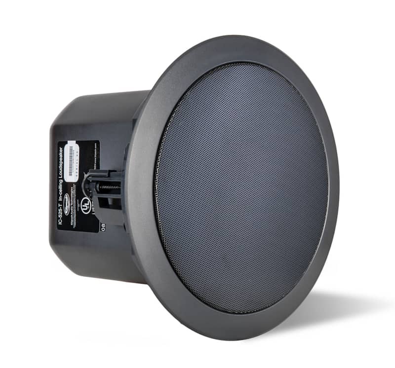 Klipsch 5.25″ Black 2-Way In-Ceiling Loudspeaker – IC-525-TThe IC-525-T packs proven materials and wide dispersion horn technology into an installer-friendly, UL-2043 and 1480 certified loudspeaker with an integrated back can and multi-tap transformer. IC-T Series speakers have been included in a number of major installations nationally, from Bloomingdales in New York City to the Ron Jon Surf Shop in Orlando. The two-way IC-525-T features a 5.25-inch woofer, and a titanium diaphragm compression driver on a 3.5-inch round modified XT Tractrix? Horn for smooth response with constant directivity. A Tractrix port design helps to provide deeper, fuller bass with less compression and distortion, while a new, more compact design simplifies low ceiling mounting. For distributed line applications, the IC-525-T features a 70/100 volt multi-tap transformer. A single rotary switch for the 8-ohm bypass and multi-tap setting is conveniently located under the speaker grille. The IC-525-T is shipped complete with a tile bridge for installation in a suspended ceiling or wherever additional reinforcement of the ceiling material is required. Features: