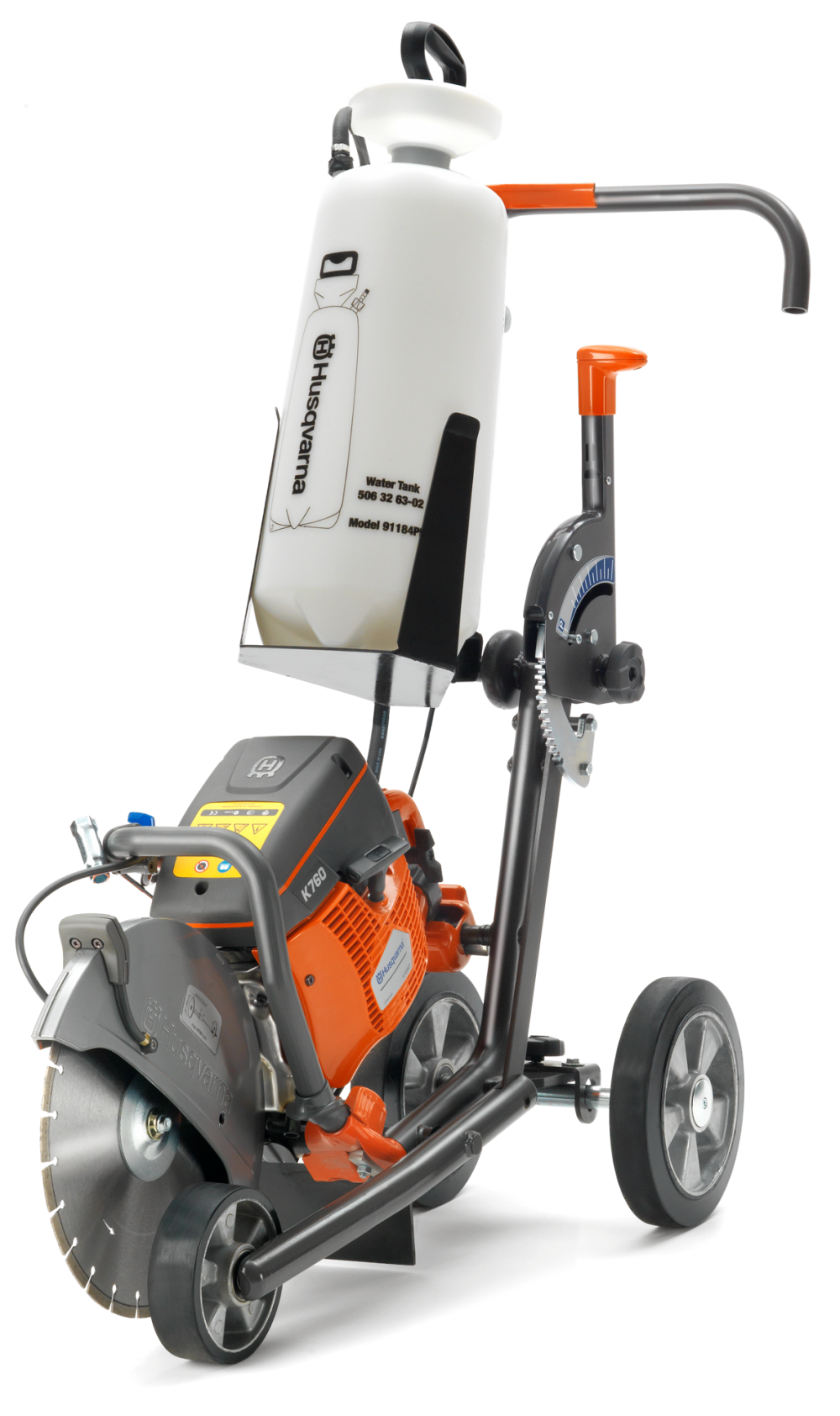 The removable 4 gallon (13.3 liter) pressurized water tank and 10 ft (3 m) hose (connects water to blade guard) is standard. Allows hours of cutting with or without cart.