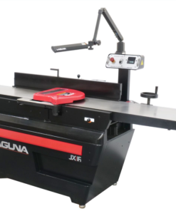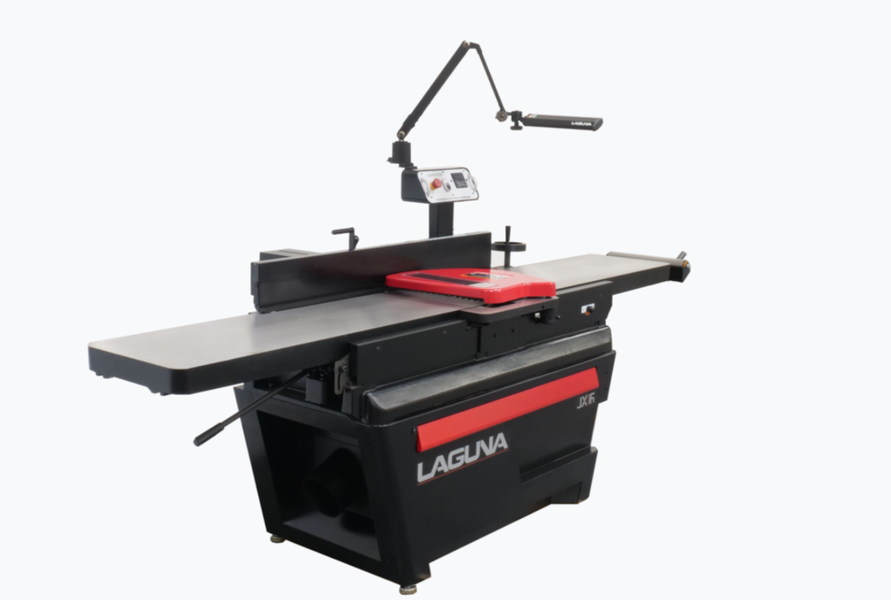 The Laguna JX|16 ShearTec II is loaded with premium features to make jointing safer and more enjoyable. The ShearTec has adjustable table lengths and in-feed support rollers for pull-out support for longer materials. It also has an emergency knee-stop bar to allow the operator to safely and quickly shut down the machine without having to move his hands. Along with that is a redesigned “toe-kick” to allow the operator to position themselves closer to the machine table to move safer and easier along the length of the machine. The JX also has a built-in outlet for optional led work lights.