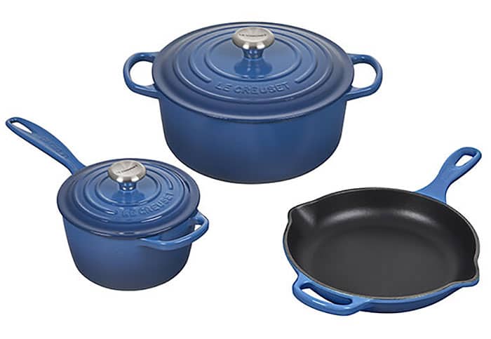 Le Creuset MS1605-59SS 5-Piece Marseille Signature SetThe 5-piece Signature cookware set features our best selling enameled cast iron pots and pans, including our iconic Dutch oven and highly-rated signature skillet. Whether just starting to build your Le Creuset collection or adding to an existing collection, this set is the perfect place to start. It also makes an exceptional gift for weddings, showers, housewarming and for the person who loves to cook and entertain. Individually crafted by French artisans from the finest quality materials since 1925, Le Creuset enameled cast iron cookware is beloved for its perfected design and exceptional heat retention that produces superior results from stove to oven to table. Designed for generations of durability, the easy-to-clean porcelain enamel requires no seasoning, minimizes sticking and is dishwasher-safe. Set includes: 5 1/2 qt. round Dutch oven, 1 3/4 qt. signature saucepan and 9″ signature skillet. Features
