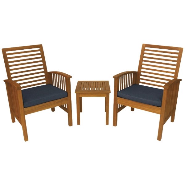 3-piece patio chat set. Modern, elegant design that is made with natural hardwood Acacia. Features wide seating and an ergonomic back designed for maximum comfort. Includes 2 chairs with blue cushions, and 1 end table. Each chair comes with a polyester woven cushion for soft supportive seating, and the wood is sanded and stained for a smooth finish. This set is ideal for the poolside, porch, patio, or indoor/outdoor living space. Quick and easy assembly, hardware included.