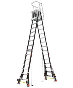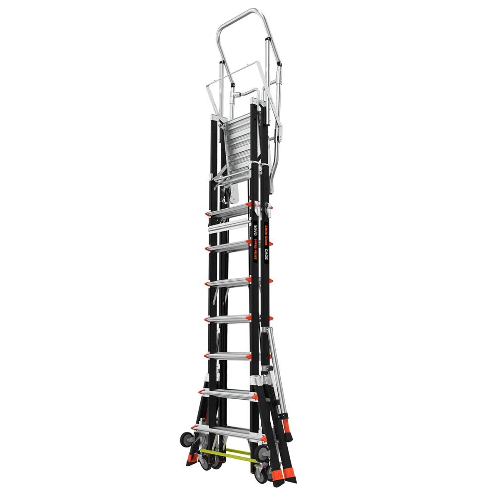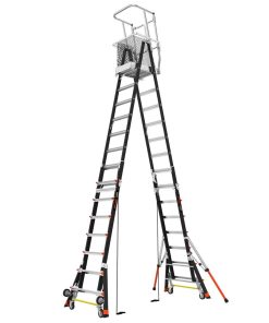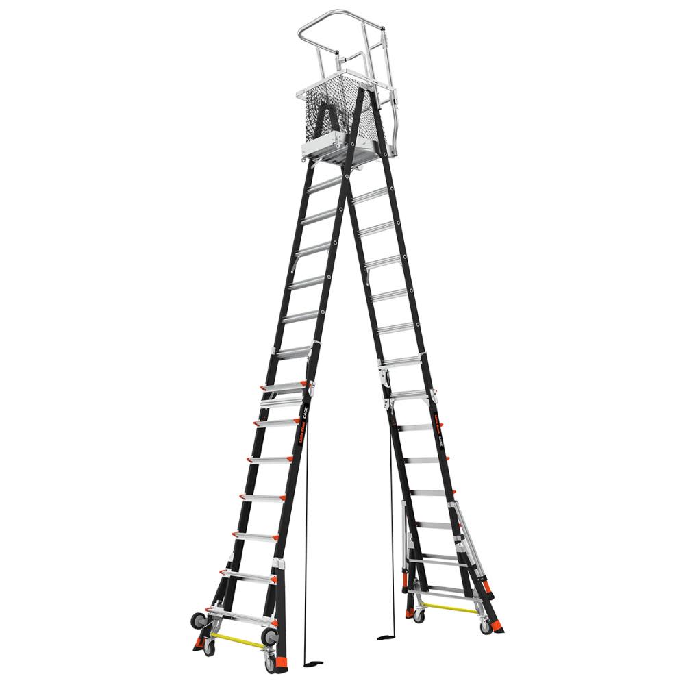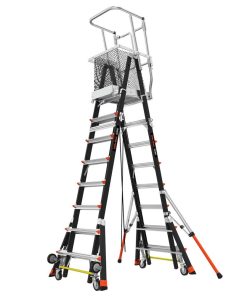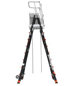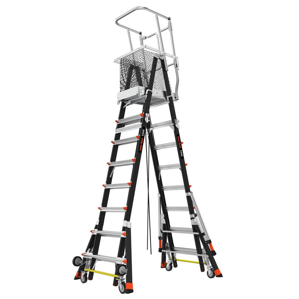 In many industries, company rules require professionals working at heights to tie off to a suitable anchor point before they can work with both hands. In some circumstances, these standards are often difficult or even impossible to keep, and often result in operators working in unsafe positions. And sometimes professionals are compelled to use expensive, time-consuming scaffolding systems. The Little Giant adjustable Safety Cage? is a versatile, safe alternative to tying off, and a much faster, much more inexpensive alternative to many scaffolding applications. The Cage is constructed of non-conductive, high-strength fiberglass-resin composite. The Cage is fully adjustable in one-foot increments, allowing the operator to adjust the platform height to the job at hand. Each side adjusts independently, so operators can also use the Cage over uneven surfaces or stairs, where a mechanical lift or ordinary stepladder could never go. And the Cage protects operators in a fully enclosed working platform, allowing them to work safely and quickly with two hands while complying with industry regulations. Time- and energy-saving Tip and Glide? wheels make it quick and easy to move from job to job. The Cage is also available with Wheel Lift? Casters that allow you to easily move the Cage from place to place while fully deployed.