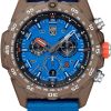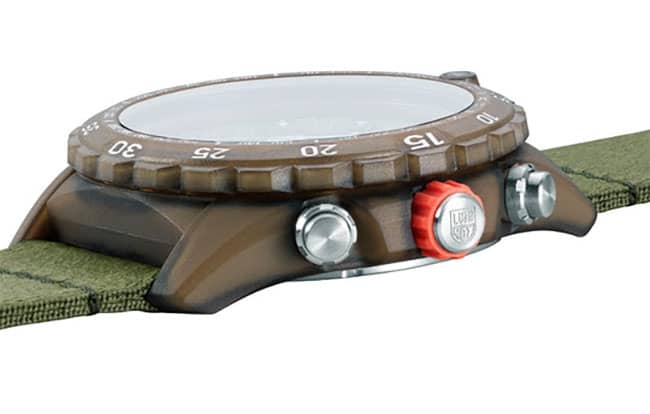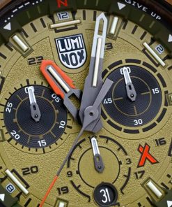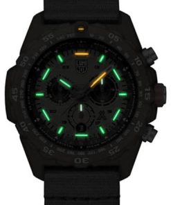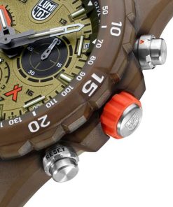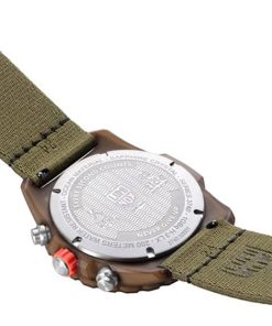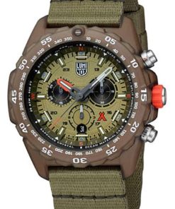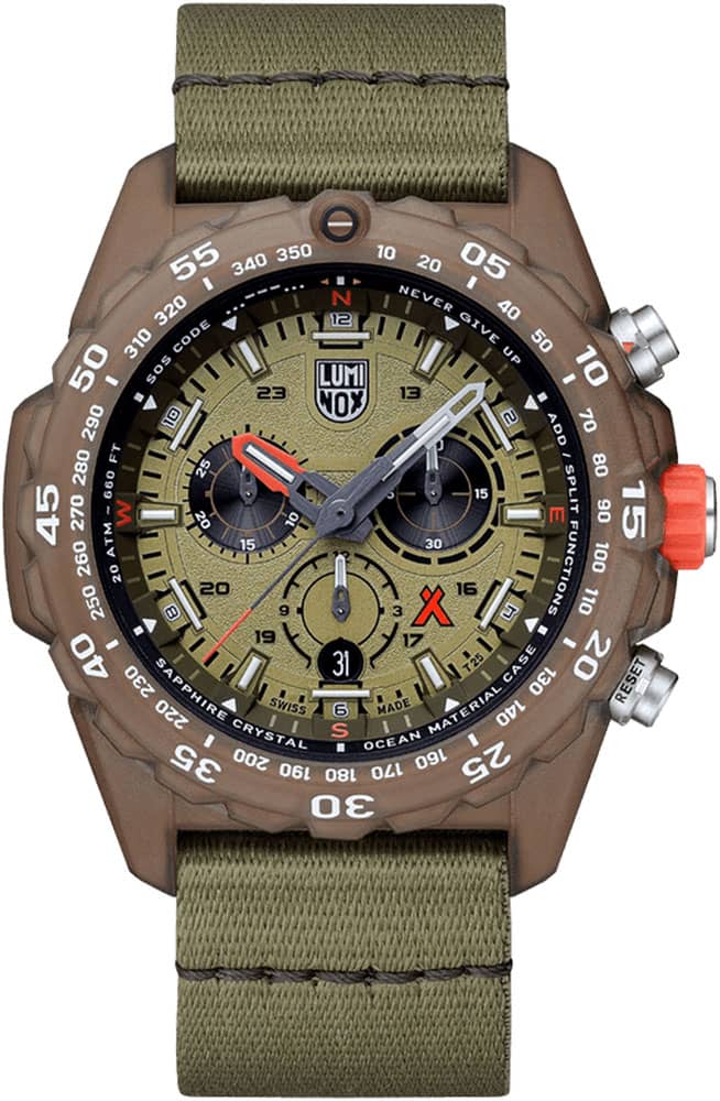 Luminox Bear Grylls #TIDE Survival ECO Master 45mm Sustainable Outdoor Chronograph Watch w/ Olive Green Dial & Strap, Model XB.3757.ECO#TIDE ocean materials are made from 100% ocean-bound plastic, developed in partnership with Swiss scientists. On five islands in the Andaman Sea off the coast of Thailand, local fishermen are being trained and paid to gather and sort plastic waste. Bear Grylls challenged Luminox to push even further in its quest for sustainability, by utilizing new upcycled plastic material for the case and black strap in partnership with #TIDE. The ecofriendly material provides equal durability and water resistance, both adventure essentials, as CARBONOX?. Features Bear Grylls Survival Series