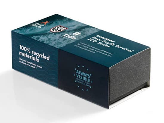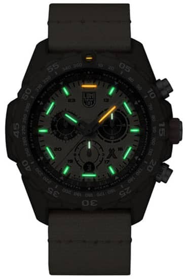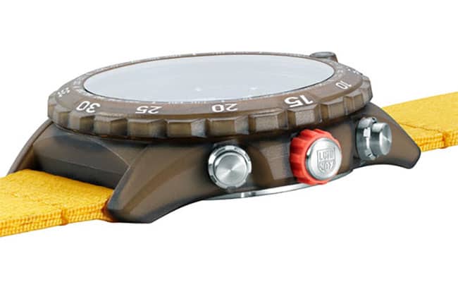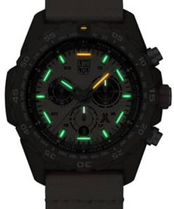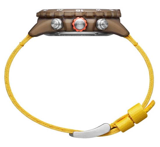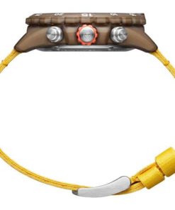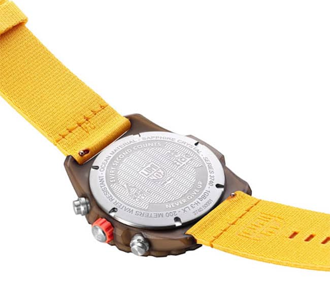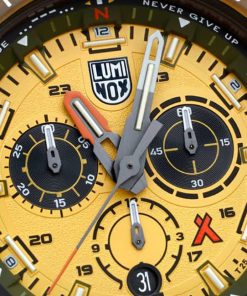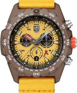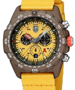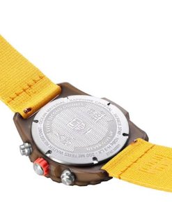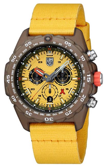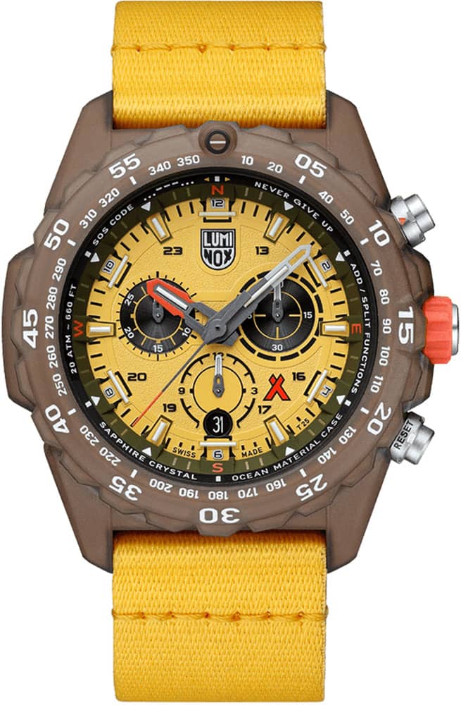 Luminox Bear Grylls #TIDE Survival ECO Master 45mm Sustainable Outdoor Chronograph Watch w/ Yellow Dial & Strap, Model XB.3745.ECO#TIDE ocean materials are made from 100% ocean-bound plastic, developed in partnership with Swiss scientists. On five islands in the Andaman Sea off the coast of Thailand, local fishermen are being trained and paid to gather and sort plastic waste. Bear Grylls challenged Luminox to push even further in its quest for sustainability, by utilizing new upcycled plastic material for the case and black strap in partnership with #TIDE. The ecofriendly material provides equal durability and water resistance, both adventure essentials, as CARBONOX?. Features Bear Grylls Survival Series