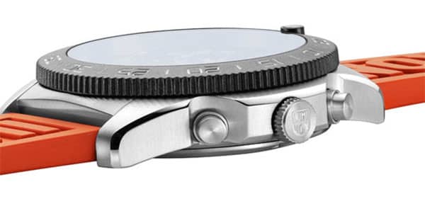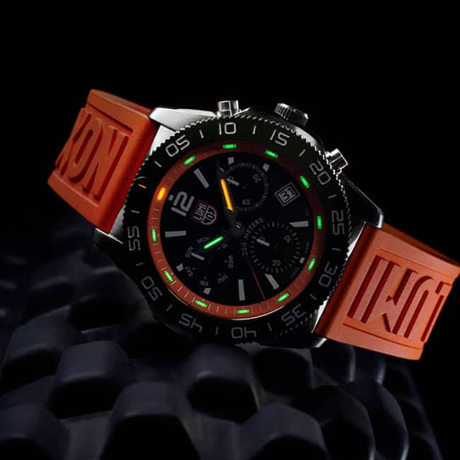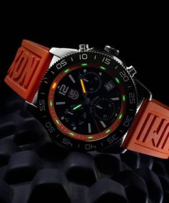 Luminox Pacific Diver 44mm Chronograph Diver Watch w/ Black Dial Orange Rubber Strap, Model 3149The new Pacific Diver Chrono boasts 44mm stainless steel case with a CARBONOX? unidirectional bezel ?? a vital instrument for any diver. Luminox offers a cut-to-fit rubber strap providing an easy and perfect fit. As with every other Luminox timepiece, it incorporates Luminox Light technology, making sure that your timepiece is visible in any condition for up to 25 years. |
