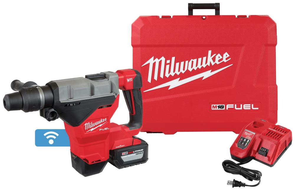 The Milwaukee? M18 FUEL? 1-3/4 in. SDS max rotary hammer w/ ONE-KEY? has the power of a 15 A corded rotary hammer with a 1-3/4 in. capacity, 8.1 ft-lbs of impact energy, 380 RPM, and 2,900 BPM. The cordless rotary hammer is designed for the professional user, allowing ultimate power, control, safety, and productivity. The POWERSTATE? brushless motor delivers 8.1 ft-lbs of impact energy. REDLINK Plus? intelligence tool technology ensures maximum performance and protects it from overload, overheating, and over discharge. The M18 REDLITHIUM? HIGH OUTPUT? HD12.0 battery delivers unmatched run-time. It allows the SDS-Max hammer drill to chip 1/2 ton of material per charge, working harder for longer. The full feature hammer delivers maximum control and enhanced safety with the AUTOSTOP? E-Clutch. This prevents over-rotation in case the tool gets bound up while being used in drilling rebar or hard aggregate applications. Competitive tools can rotate up to 360 degrees while the Milwaukee rotary hammer will stop rotating at 45 degrees. This ensures users work safer and have more control while on the job. The cordless rotary hammer is compatible with ONE-KEY?, wirelessly connecting to smart phones to track and manage the tool performance and location. ONE-KEY? integrated tool tracking gives full visibility over how and where tools are being used across a network of jobs and users.