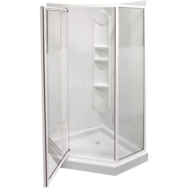 Textured ABS base, 3-piece polystyrene wall system, 3 shelves and 1 towel bar, right or left installation for pivot door. Frosted wave/clear glass pattern, tempered glass. Drain cover included. Glue up installation. 38″ x 38″ x 74″ high. 1 year warranty.