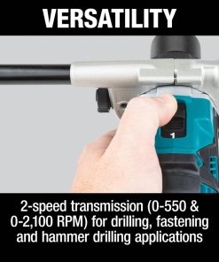 Variable 2-speed Hammer Driver-Drill with Makita-built Brushless Motor delivers (0-550 & 0-2,100 RPM) and 1,250 in.lbs. of Max Torque; weights only 6.1 lbs. with battery