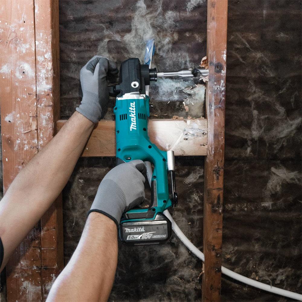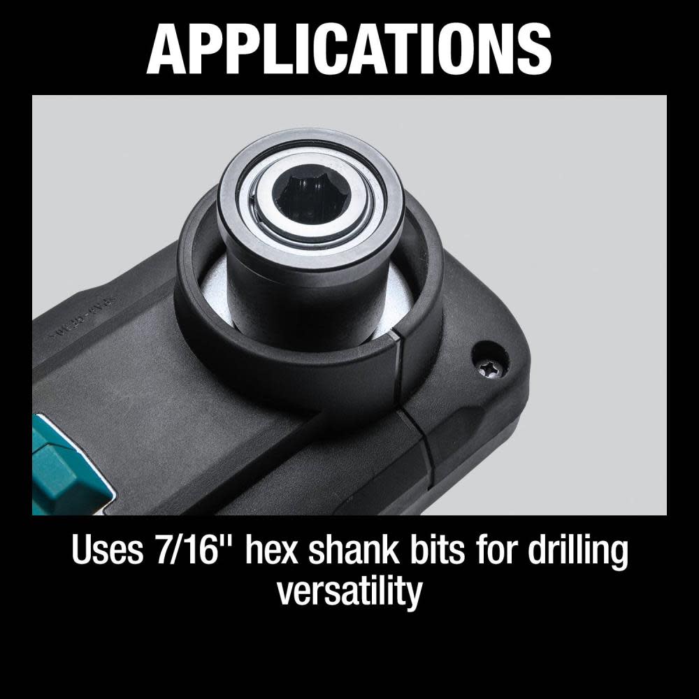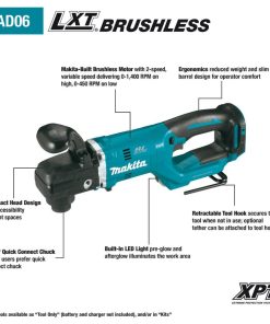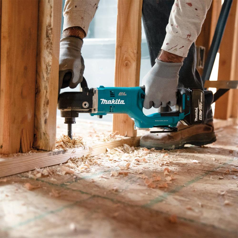 The 18V LXT? Brushless 7/16?? Right Angle Drill Kit (XAD06T) offers freedom from the cord, with superior cordless drilling speed. The XAD06 will take on the most demanding applications like drilling up to 5?? holes with hole saws and 2-9/16?? holes with self-feed bits.