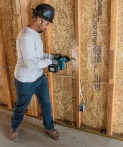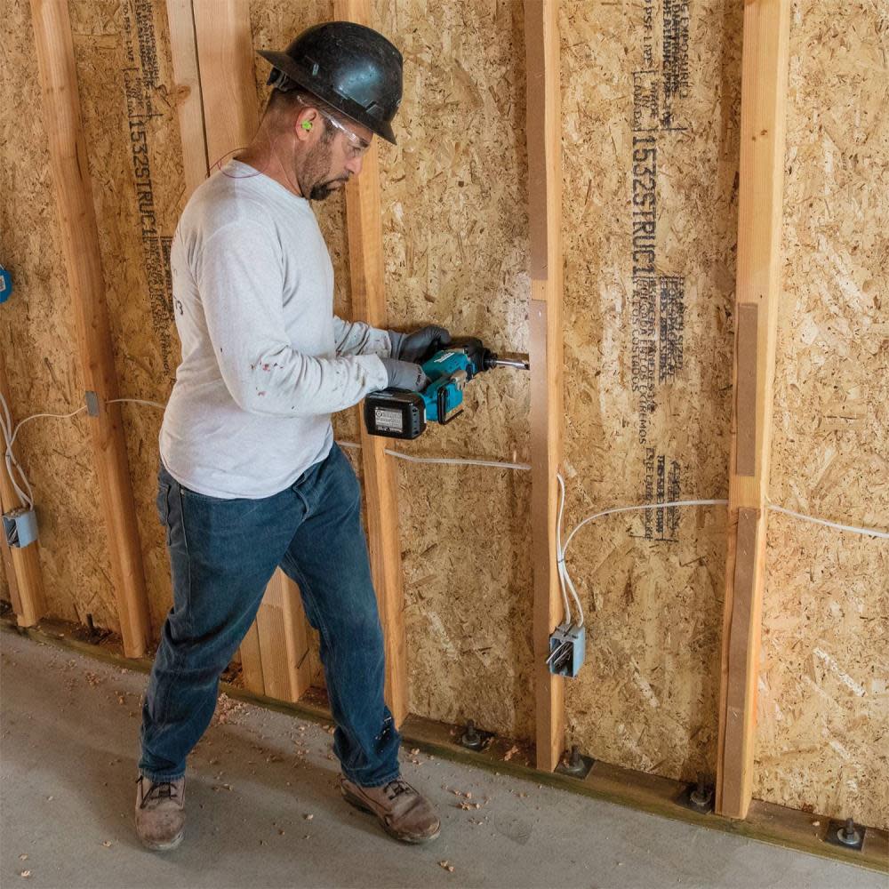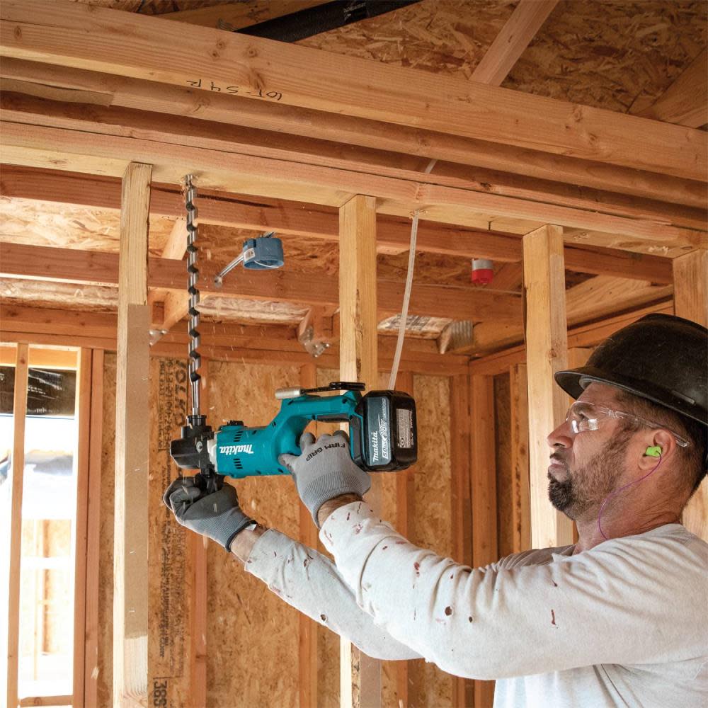 The XAD06 has a long list of features for drilling with superior speed and efficiency. The brushless motor and two-speed transmission deliver no-load speeds of 0-450 RPM and 0-1,400 RPM. Users also benefit from longer run time: the XAD06 will deliver up to 105 1-1/2″ holes per charge in 2x SPF lumber using one 18V LXT 5.0Ah Battery and a self-feed bit.