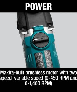 Makita-built brushless motor with two speed, variable speed (0-450 RPM and 0-1,400 RPM) for maximum efficiency and a wide range of drilling applications