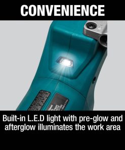 Added features include metal gear housing for durability, an electric brake for maximum productivity, and dual L.E.D. lights to illuminate the work area. It includes a side handle that attaches to either side of the tool.