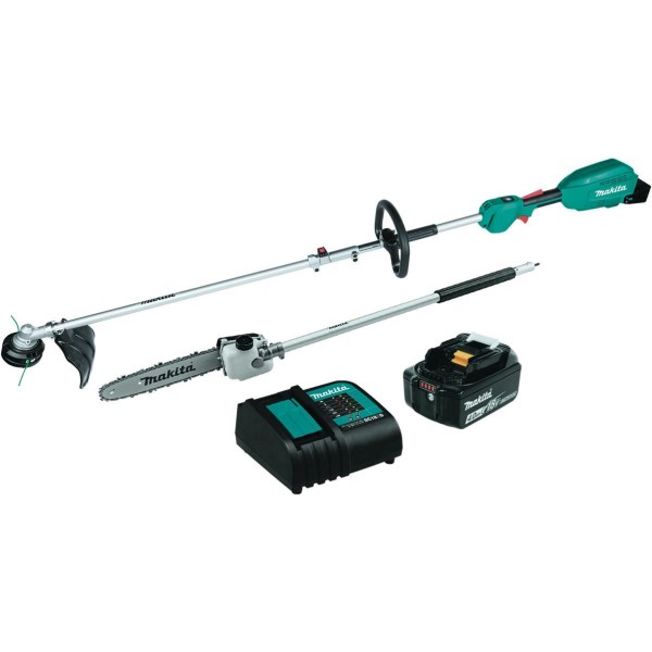 The 18V LXT Brushless Couple Shaft Power Head Kit with String Trimmer and Pole Saw attachments is a welcome solution for a range of trimming and cutting applications. With zero emissions, lower noise and maximum versatility, the power head delivers maximum performance and run time without the hassles of gas and without leaving the 18V LXT battery platform. The lever-style lock system allows for quick tool-less installation and replacement of attachments. The 10″ Pole Saw Attachment provides 7-foot fixed length for trimming hard-to-reach branches and the String Trimmer Attachment includes a rapid loading bump and feed trimmer head loaded with 0.080″ twisted quiet line. The couple shaft can also be used with multiple other attachments for edging, cultivating, and brush cutting (sold separately). The Makita-built brushless motor delivers up to 7,000 RPM with String Trimmer Attachment and 3,940 FPM with a 10″ Pole Saw Attachment. Makitas efficient brushless motor is electronically controlled to optimize battery energy use for up to 50% longer run time per battery charge than similar non-brushless tools. Other features include a variable speed trigger to control cutting speed and Extreme Protection Technology (XPT). XPT is a protective seal inside the tool, engineered for improved operation in harsh conditions by channeling water and dust from key internal components. Its part of Makitas expanding 18V LXT System, the world’s largest cordless tool system powered by 18V lithium-ion slide-style batteries. Makita 18V LXT Lithium-Ion Batteries have the fastest charge times in their categories, so they spend more time working and less time sitting on the charger. For improved tool performance and extended battery life, Makita created Star Protection Computer Controls. Star Protection is a communication technology that allows the Star Protection-equipped tool and battery to exchange data in real-time and monitor conditions during use to protect against overloading, over-discharging and overheating. For increased versatility, the tool can also be powered by Makita 18V LXT Lithium-Ion Batteries with the star symbol on the battery indicating Star Protection inside.
