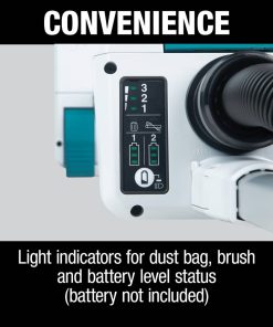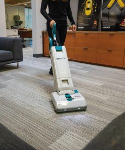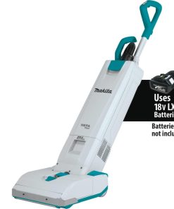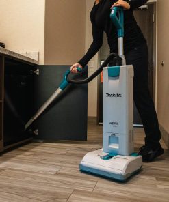 The Makita 1.3 gal 12 Inch upright vacuum is powered by a brushless motor that delivers 67 cfm of suction power and 48 Inch of water lift. Lithium-Ion batteries offer up to 60 minutes of continuous run time on low setting and 30 minutes on high setting. The efficient two stage HEPA filtration system has capacity to capture up to 99.97% of particulates and also maintains optimum suction efficiency and longer filter life. Brushless motor is electronically controlled to minimize battery energy use up to 50% longer run time per charge. The star protection computer controls safeguards from overloading, over-discharging and over-heating. Built-in LED light illuminates work area allowing to work with ease even in low light conditions. The non-marring bumper safeguards damage to furniture, baseboards, door-frames and walls. Light indicators are provided for dust bag, brush and battery to indicate the battery status. The four-height adjustment levels ensures optimal cleaning on all floors. Toolless design and accessible brush roller allows for easy removal of hair and clogs. It includes filter bag, HEPA filter, round brush and long sash nozzle.
