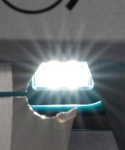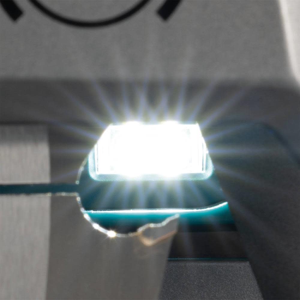 Convenience features include an L.E.D. light with pre-glow and afterglow to illuminate the work area, an onboard hex wrench for blade changes, and a secondary handle for two-handed operation.