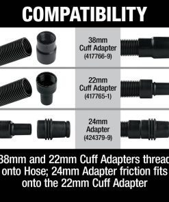 Equipped with anti-static hose (1″ x 11??) and three adapter cuffs (22, 24 and 38 mm) for dust extraction