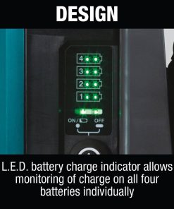 Integrated L.E.D. battery charge level indicator allows monitoring of battery charge on all four batteries individually