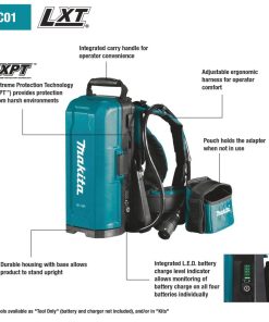 The Makita portable backpack power supply offers up to 2X run time with LXT? X2 products and 4X run time with LXT? 18 Volt products. The LED battery charge indicator allows to individually monitor the charge on all four batteries. The durable housing with base enable product to stand upright. Star protection computer control safeguards against overloading, over-discharging and over-heating. Battery box can be detached from the harness and can be used as a stationary power supply. Adjustable ergonomic harness offers great operator comfort. IPX4 weather-resistant construction offers long lasting durability. The same fast-charging 18V batteries that power over 300 LXT? products can also run ConnectX? products when used with the versatile Portable Backpack Power Supply (PDC01). Simply load two or four 18V LXT? batteries into the PDC01 Backpack and connect directly to ConnectX? commercial power equipment. Or use an adapter for use with LXT? products. Ultimate Compatibly powers ConnectX?, 40V max XGT? and LXT? 18V X2 (36V) systems (40V max adapter sold separately).