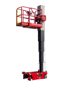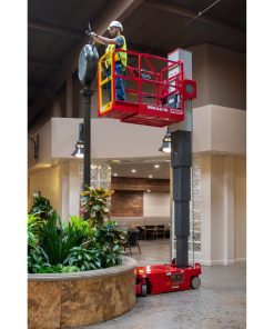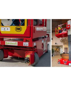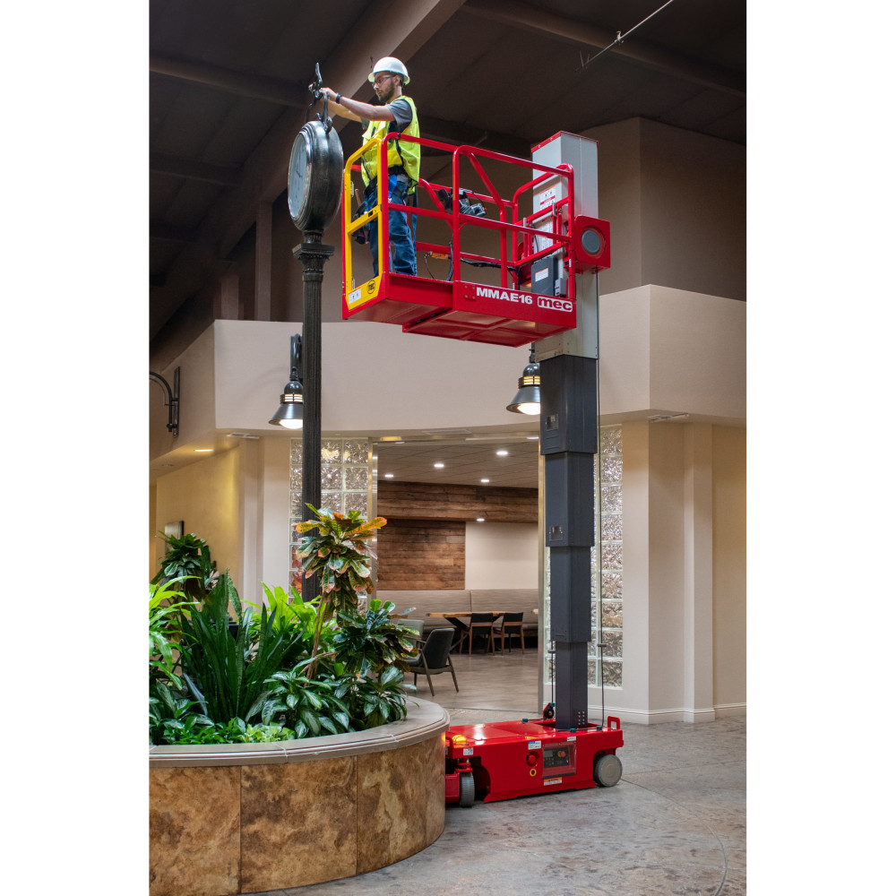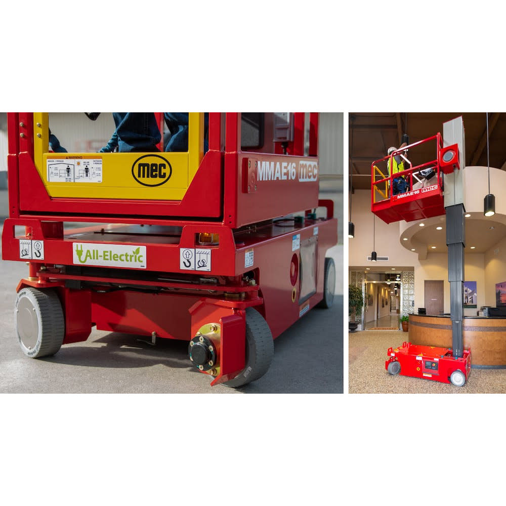 MEC’s All Electric vertical mast offers the industry’s prevailing 16 Ft. platform height while delivering enhanced features for better productivity, accessibility and durability. Optimal duty cycle with standard AGM batteries and higher residual value. Fits on most elevators and into tight work areas with a true slide-out deck and low floor loading (Ground Pressure: 110 Psi). Standard steel platform, 250 Lbs capacity glide-out deck, lift-up entry gate and more.