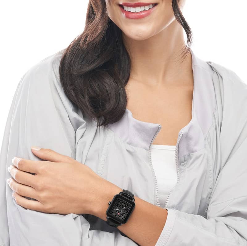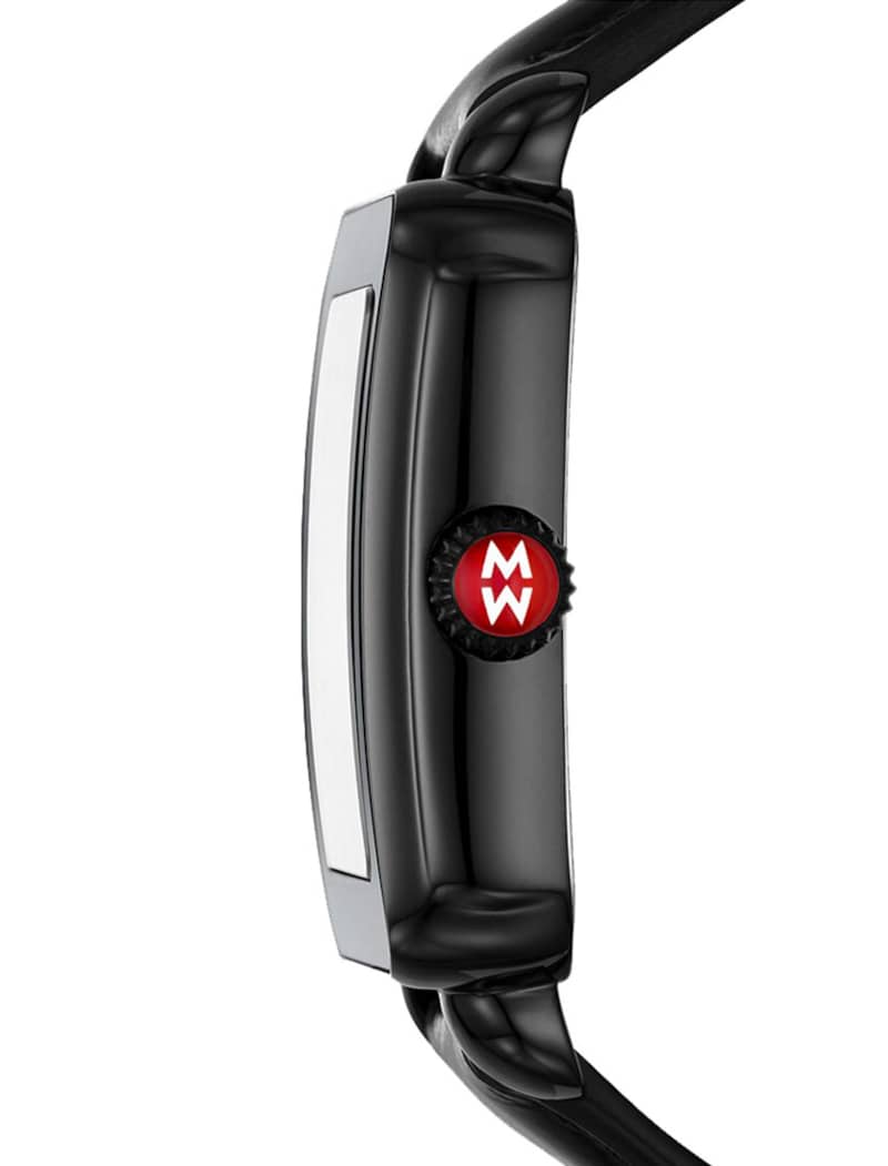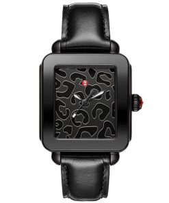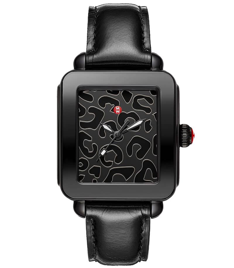 Michele Deco Sport Noir Black Cheetah Print Dial Leather Strap Watch, 36mm, Model MWW06K000051This Deco Sport Noir watch features a black cheetah print mirror dial, signature red crown and a black leather strap. The black leather strap is interchangeable with any 18mm MICHELE strap. |