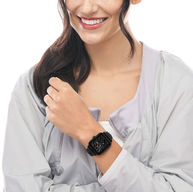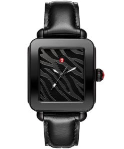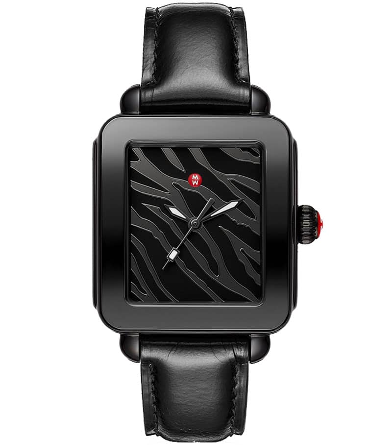 Michele Deco Sport Noir Black Zebra Print Dial Leather Strap Watch, 36mm, Model MWW06K000050This Deco Sport Noir watch features a black zebra print mirror dial, signature red crown and a black leather strap. The black leather strap is interchangeable with any 18mm MICHELE strap. |