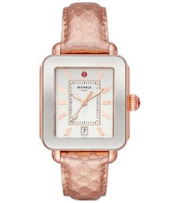 Michele Deco Sport Silver Dial Rose Embossed Leather Strap Watch, 34mm, Model MWW06K000039Easily transition your wardrobe through the seasons with the chic Deco Sport Watch which features a brush-finished dial and topring and touch of pink gold-tone detailing along the case. Made specifially for the Deco Sport collection, the 18mm rose embossed French-leather strap mimics the look of exotic skins and is interchangeable with any 18mm MICHELE strap. |