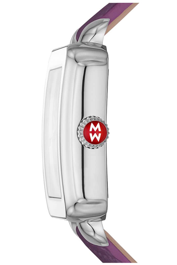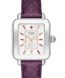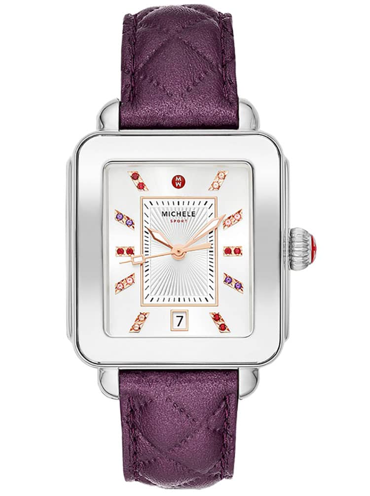 Michele Deco Sport White Sunray w/ Multicolor Topaz Dial Violet Quilted Leather Strap Watch, 33mm, Model MWW06K000049The stainless Steel Deco Sport watch features a sunray dial with multicolor semi-precious topaz indexes, signature red crown and a violet quilted leather strap for an altogether chic and sporty look. The 18mm strap is made specifically for the Deco Sport collection and is interchangeable with any 18mm MICHELE strap. |