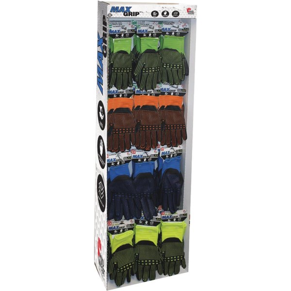 Max Grip gloves Power Panel display. Features assorted small/medium and large/extra large gloves with nitrile coated palms. Comfortable spandex liner dipped in foam nitrile with added nitrile dots on the palm. Revolutionary US patented design.