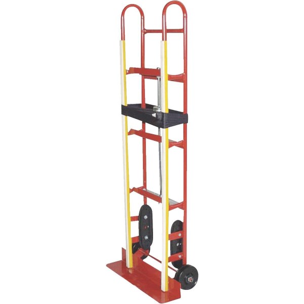 Hand truck made of 1 In. tubular steel construction. Features curved dual durometer PVC (polyvinyl chloride) supports to protect appliances, and a stair climber. Equipped with a ratchet belt tightener. 6 In. x 2 In. solid rubber tires with sleeve bearings. Overall height 60 In., overall width 24 In. 4-1/2 In. x 24 In. toe plate. 800 Lb. load rating. Powder-coat finish. For replacement wheel refer to Model No. R5464.