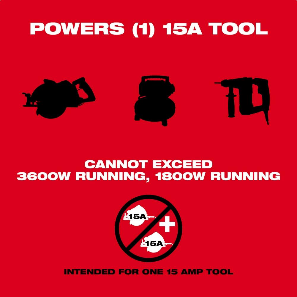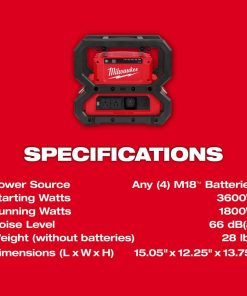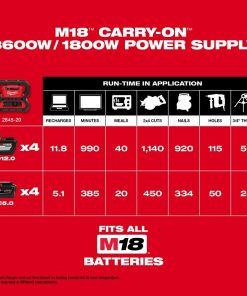 The Milwaukee M18? CARRY-ON? power supply delivers 3600 W starting, 1800 W running of pure sine wave inverter energy with longer sustained power. It is emission free and eliminate the cost of gasoline, repairs and maintenance required with any gas generator. it keeps noise level to as low as 66 dB, thereby ensuring quite operation. This supply can be used to run demanding tools like table saws, compressors as well as pipe theaters and can also be used to recharge sensitive electronics with a pure sine wave inverter with USB-C PD & USB-A. It can be used to power all 15 A tools and the instant start technology makes it the better-sustained power. The compact design of this power supply makes it perfect to operate indoors and underground. It fits all M18? batteries and is compatible with 49-16-2845 shoulder strap. The USB-C PD and USB-A port charges all your sensitive electronics faster.
