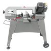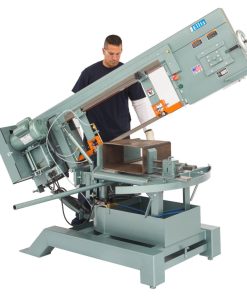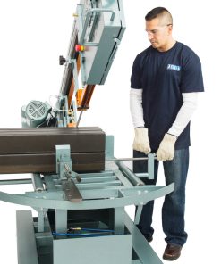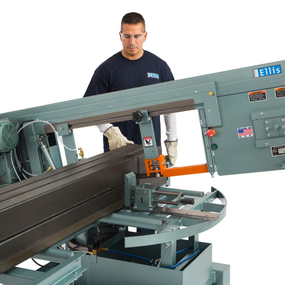 The ELLIS 4000 band saw is very popular for its dual mitering capability, extremely large cutting capacity, and rugged durability. The material stays stationary for mitre cuts, while the head rotates up to 60 degrees both left and right. Fast and accurate angle selection are possible with the built-in protractor. Head feed rate is controlled by the hydraulic control, that has a locking valve for setting up cuts. Material clamping and unclamping is quick and easy with the standard quick acting vise. This stationary band saw will meet your needs in the shop or on the work site.
