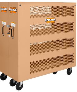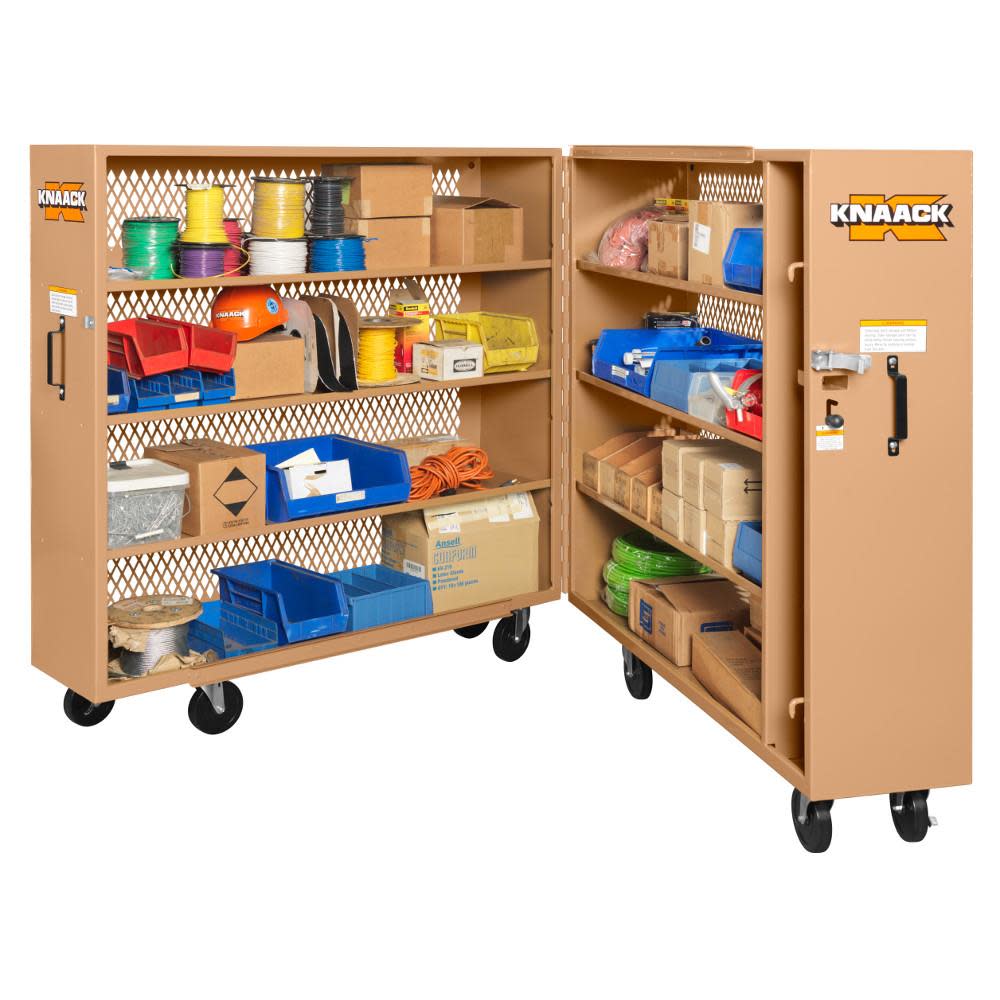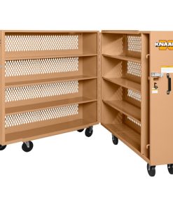The Model 100-MT Tool Kage? Rolling Cabinet is a locking tool cabinet that features the all-new 16g diamond-punched steel panels, which allow clear visibility of the cabinet contents without compromising security, making this the perfect option for jobsites and workshops alike. The locking rolling cabinet is 65in high, approximately 125in wide when fully opened, and has a capacity of 60.9 cu ft so that it can hold all of your most essential tools and equipment in an organized fashion for easy, convenient access. With shelves that are 14in deep with a 1in hemmed lip, your equipment and supplies will stay securely in place, even when moving the tool storage cabinet and the shelves are welded in place for unbeatable stability. With a load capacity of 1,200lbs, this tool storage cabinet works well for commercial electricians who need storage for small hardware and materials. The mobile tool cabinet is crafted from heavy-duty, 16-gauge steel, and finished with a corrosion-resistant powder coat for long-term reliability. The mobile tool cabinet includes a 6in caster set.