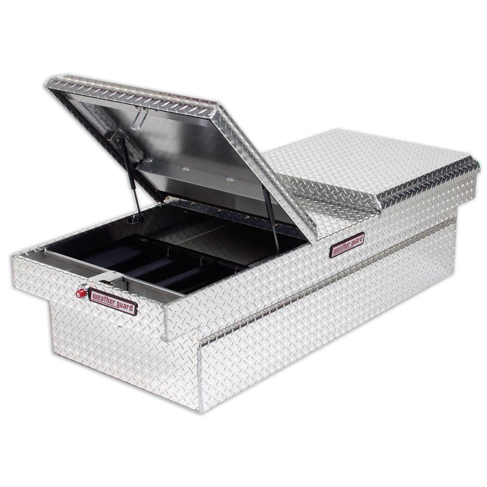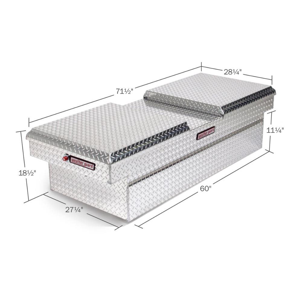 The WEATHER GUARD? Aluminum Cross Box Full-Size Extra Wide adds protected storage to the bed of your 8-foot pickup truck bed. The unit includes 15.3 cubic feet of storage space, so you have enough room to store all the tools and parts you need for the job. Separate your items using the Weather Guard cross box’s two separate compartments, and secure them with EXTREME PROTECTION? locks on the individual covers. This container hangs from the sides of your truck bed and does not touch the bed itself. The truck cross box includes a layer of ARMOR-TUFf? across its surface to protect its aluminum body from rain and snow. Installation is simple so you can start using it the first day you get the box.