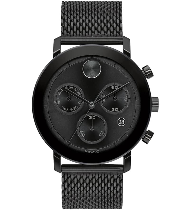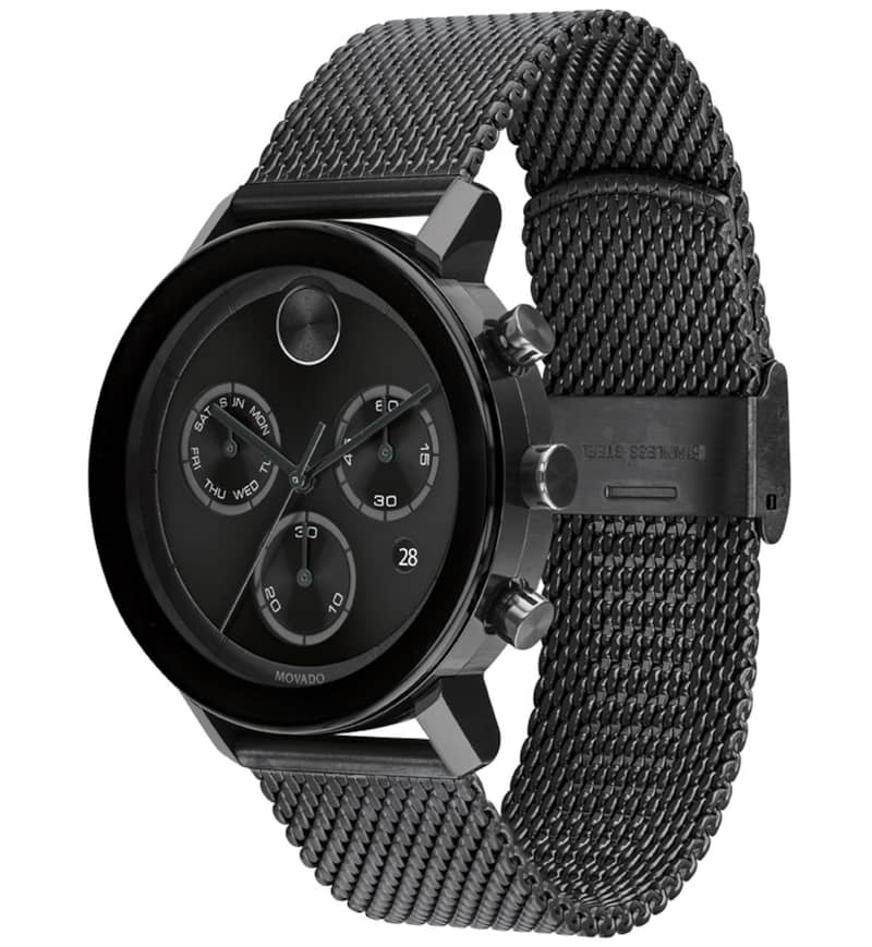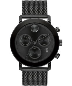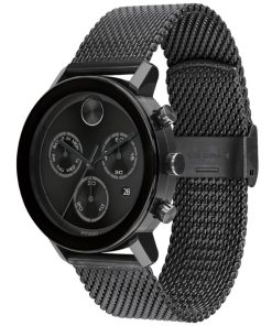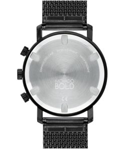 Movado BOLD Evolution 42mm Chronograph Watch w/ Black Dial & Ion-Plated Stainless Steel Mesh Bracelet, Model 3600760Movado Bold Evolution, 42 mm black ion-plated stainless steel case and mesh bracelet with black chronograph dial. Beyond The Dot: