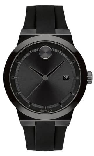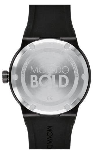 Movado BOLD Fusion 42.3mm Watch w/ Black Dial & Silicone Strap, Model 3600621Movado BOLD Fusion, 42 mm black ion-plated stainless steel case & black ceramic bezel with a black-toned dial on black silicone strap. Beyond The Dot: