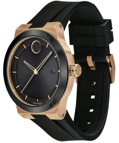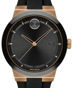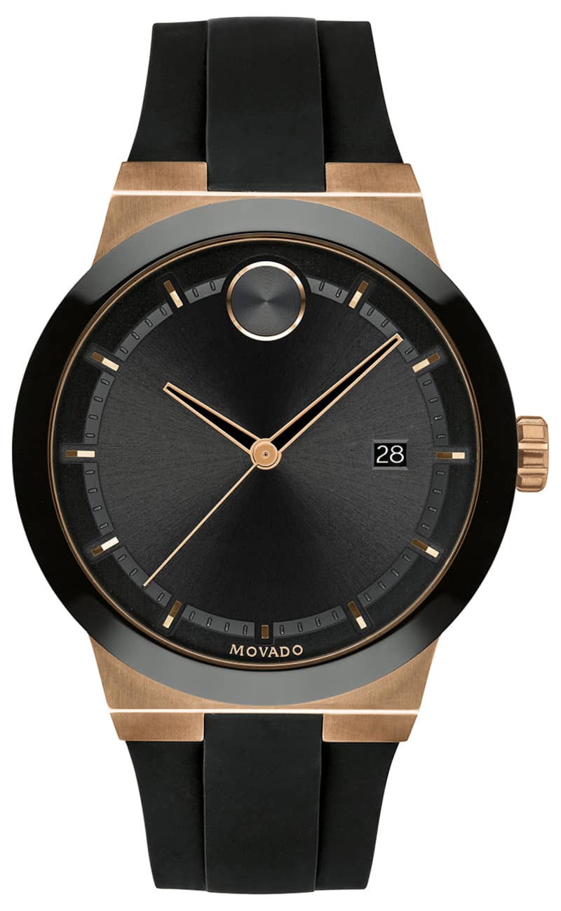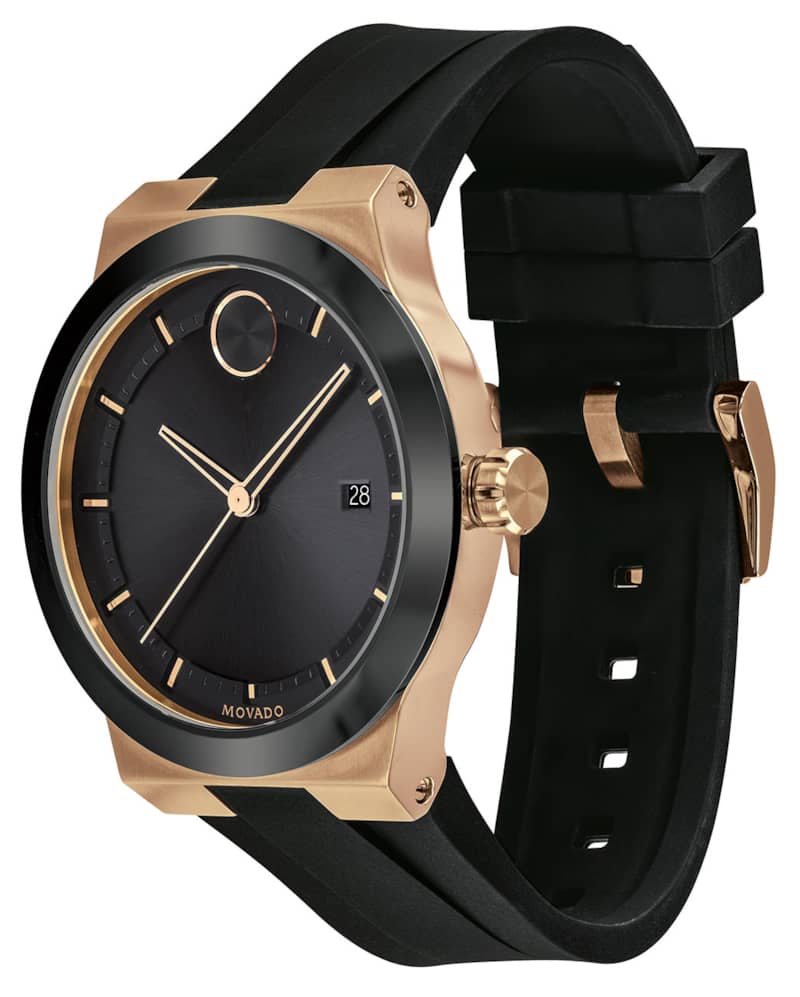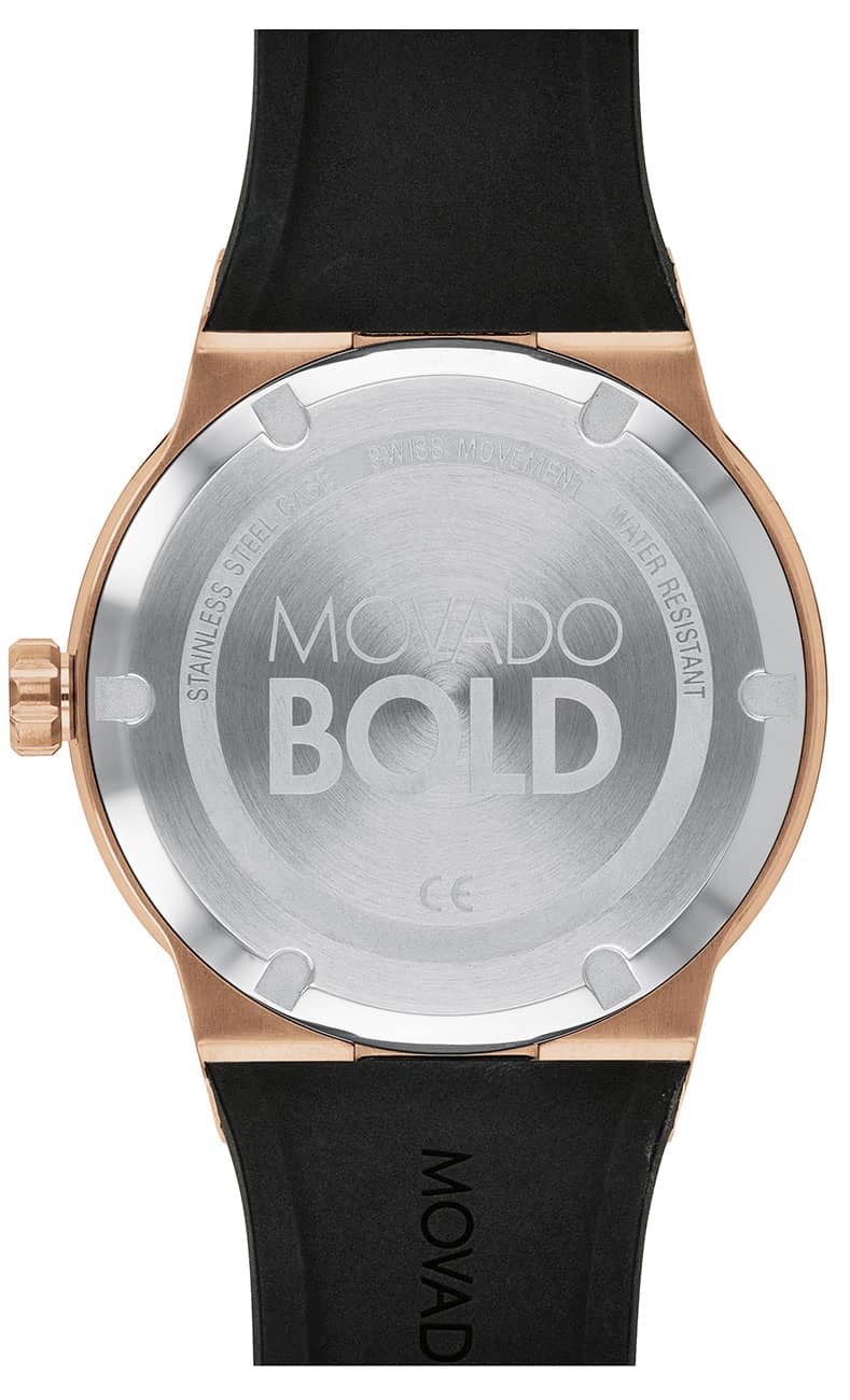 Movado BOLD Fusion 42.3mm Watch w/ Black w/ Bronze Accents Dial & Silicone Strap, Model 3600851Movado BOLD Fusion, 42 mm bronze ion-plated stainless steel case & black ceramic bezel with a black-toned dial on black silicone strap. Beyond The Dot: